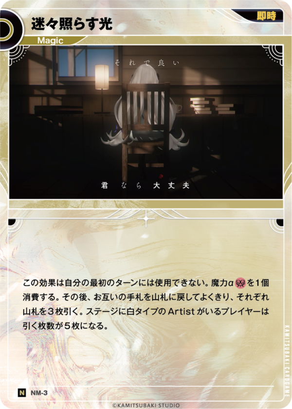 魔力αが1個以上あるなら使用できる。山札から白タイプのArtistを1枚選び、相手に見せて手札に加える。山札をよくきる。