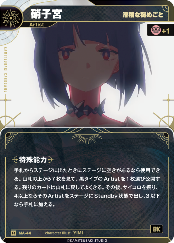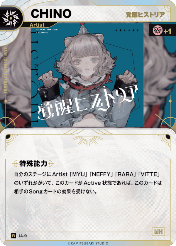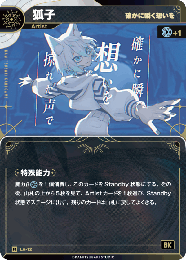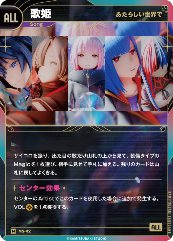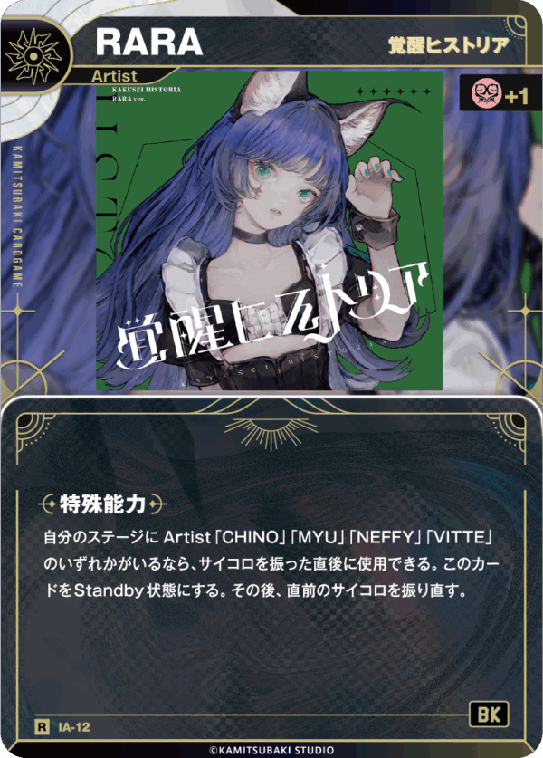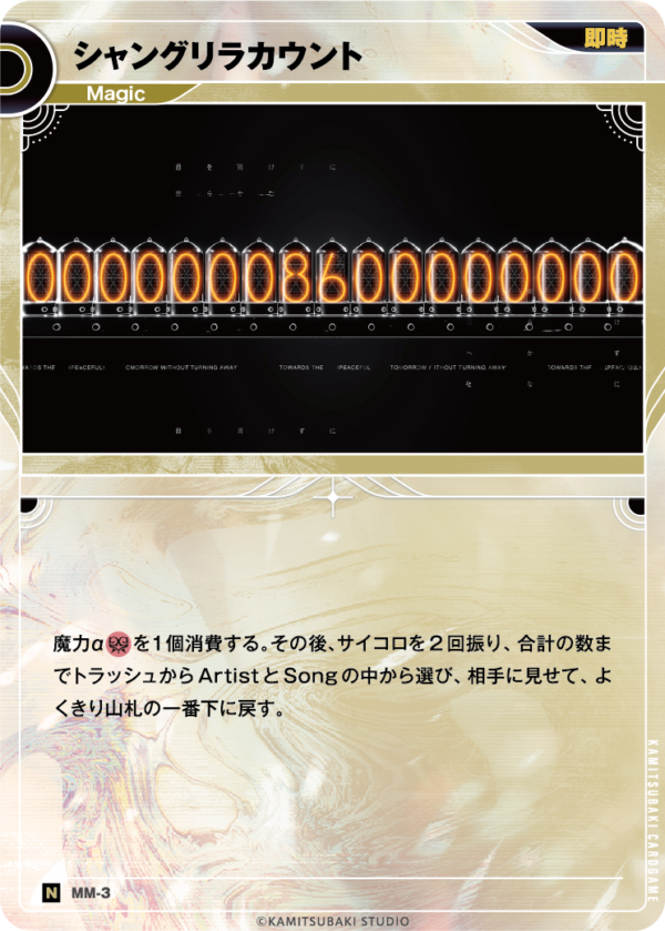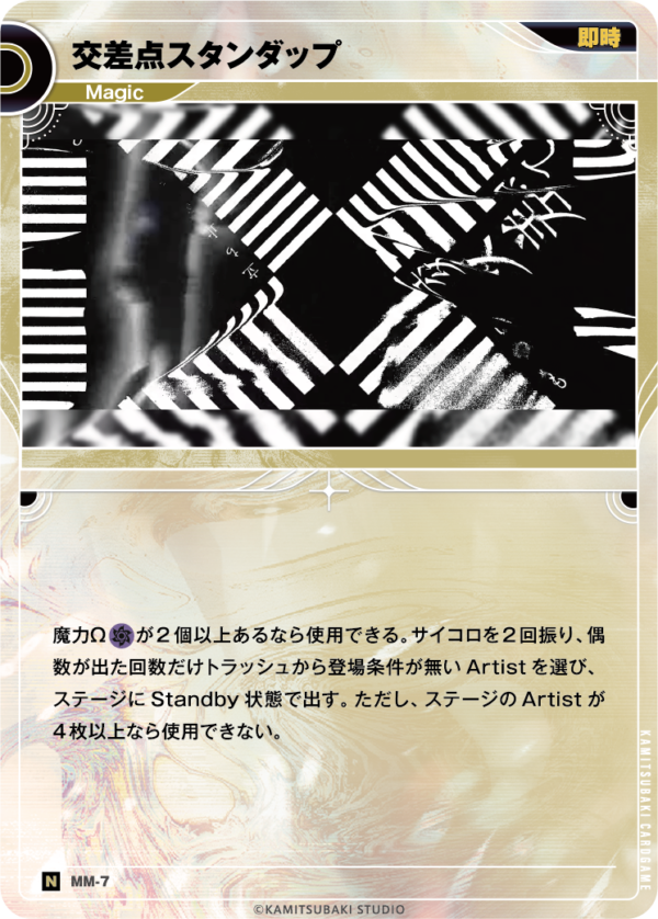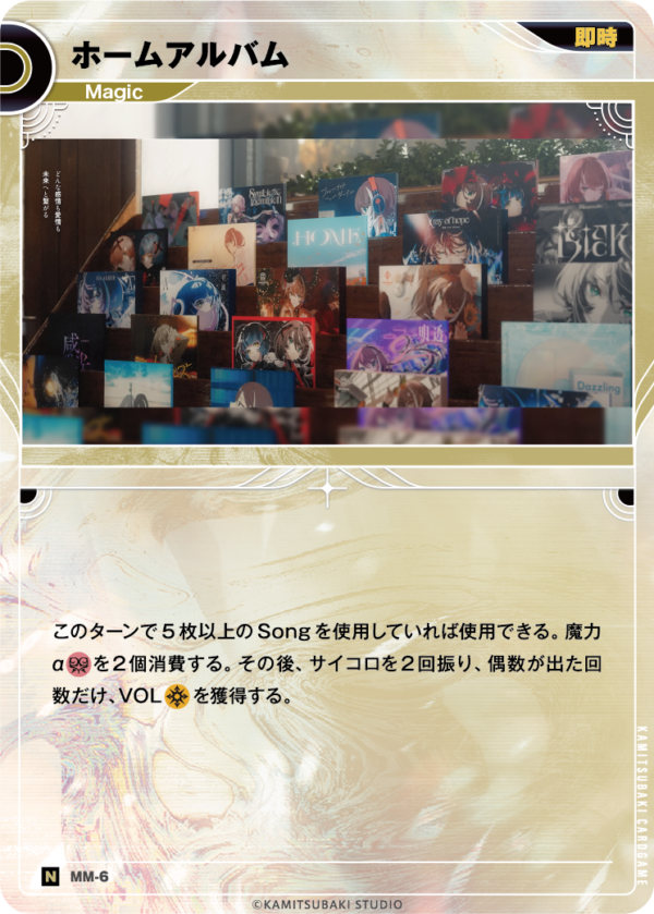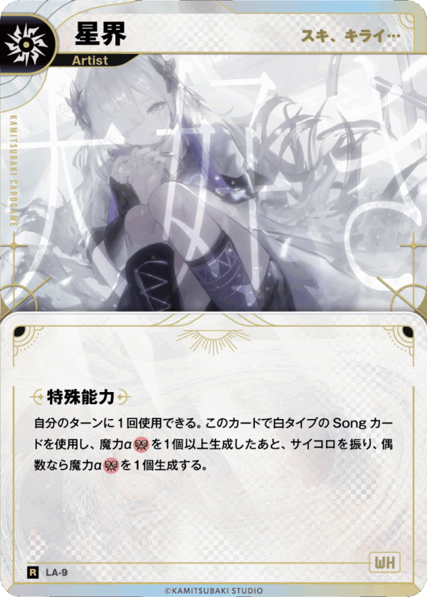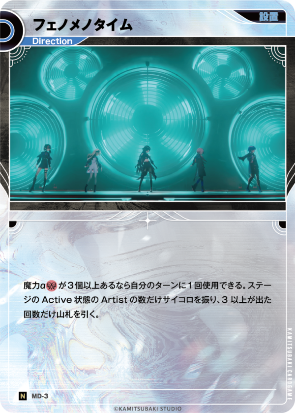 自分のターンに1回使用できる。魔力αを2個消費する。その後、サイコロを振り、4以上ならArtist「CHINO」「MYU」「NEFFY」「RARA」「VITTE」のいずれかを山札から1枚選び、ステージにStandby状態で出す。そして、山札をよくきる。ただし、ステージが空いていない時、このカードの効果は使用できない。