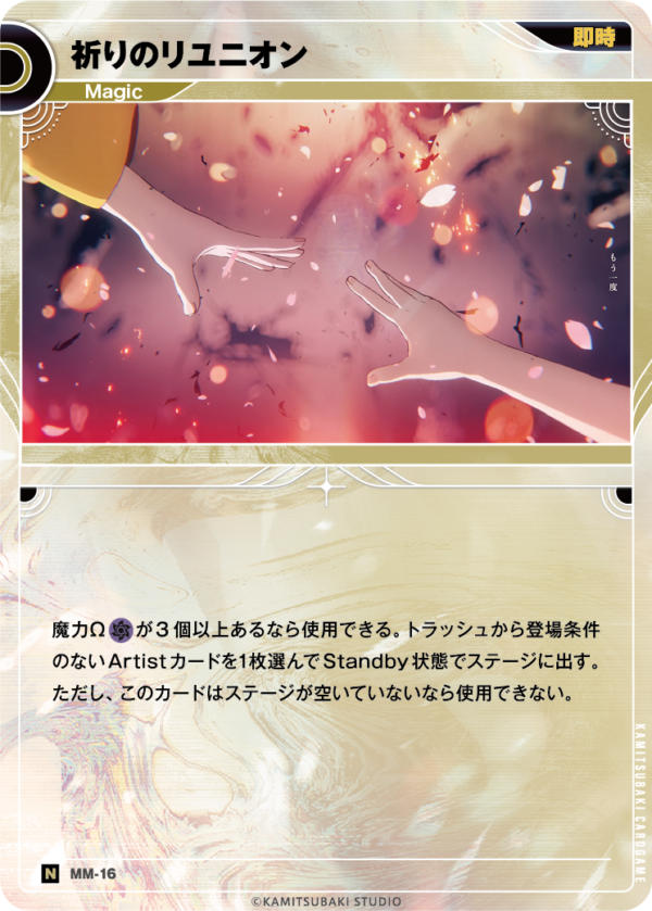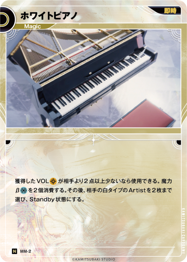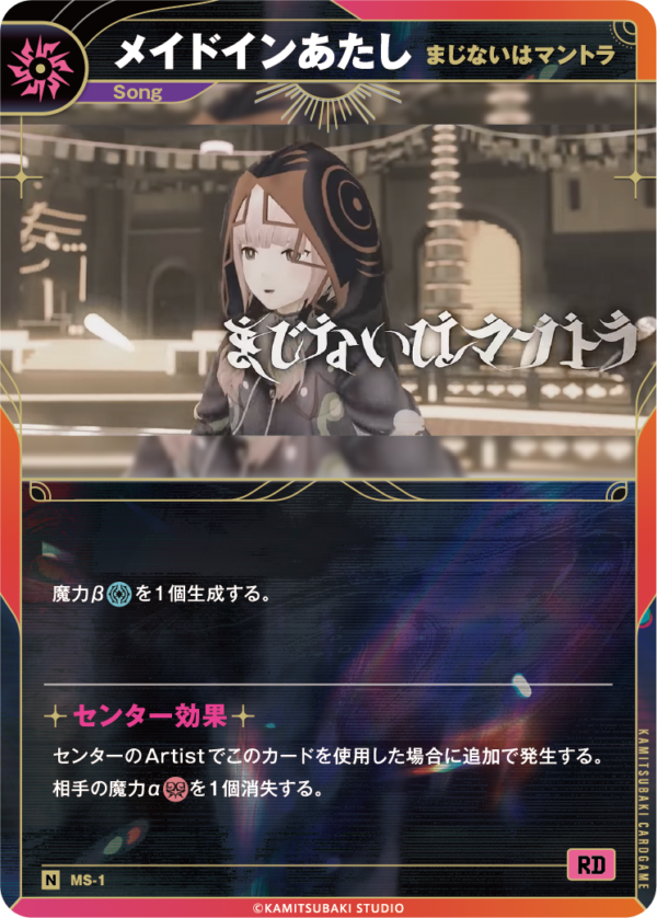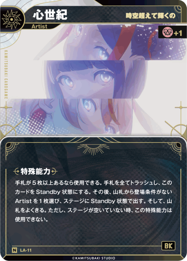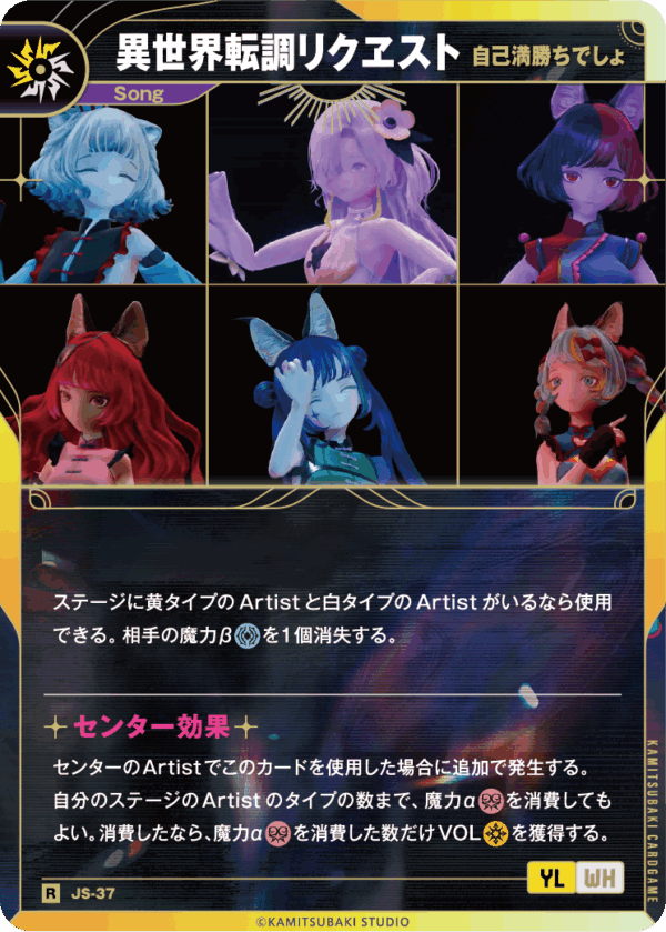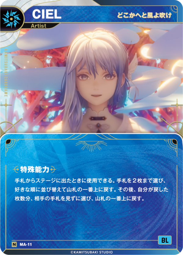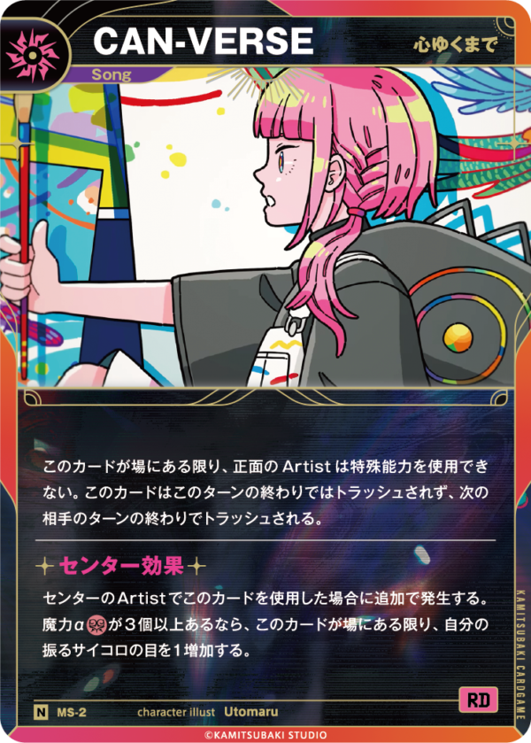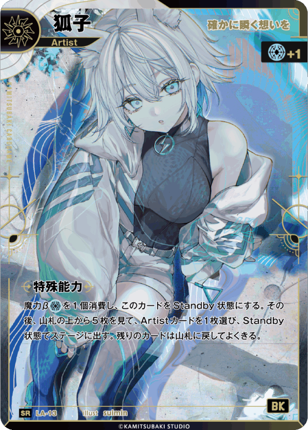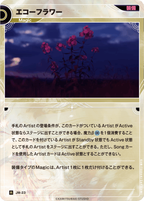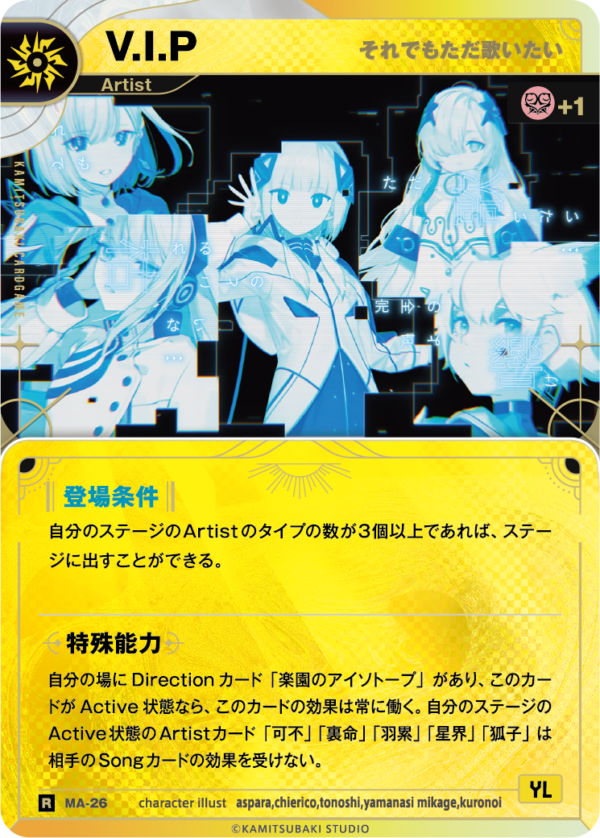 自分のターンに1回使用できる。魔力αを2個消費する。その後、サイコロを振り、4以上ならArtist「CHINO」「MYU」「NEFFY」「RARA」「VITTE」のいずれかを山札から1枚選び、ステージにStandby状態で出す。そして、山札をよくきる。ただし、ステージが空いていない時、このカードの効果は使用できない。