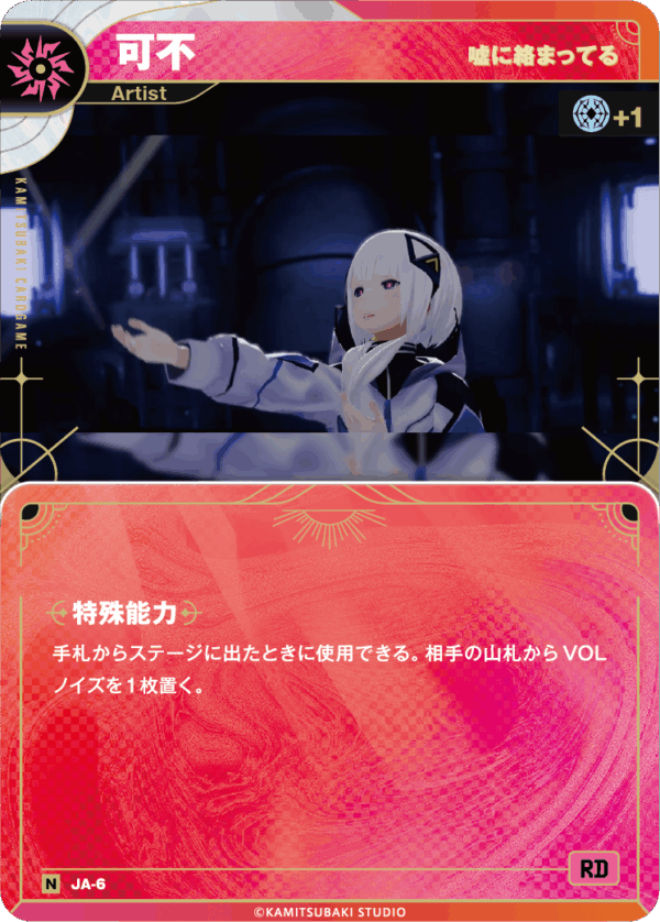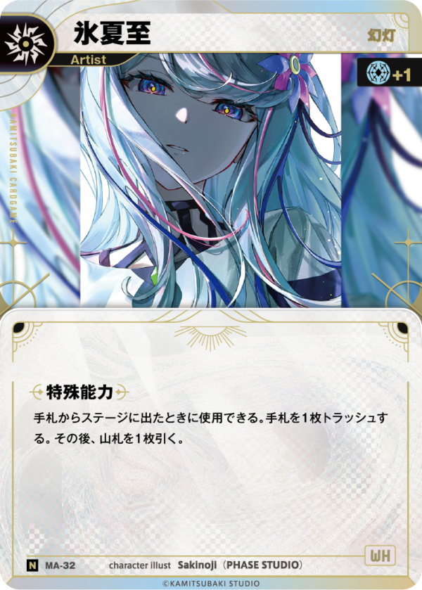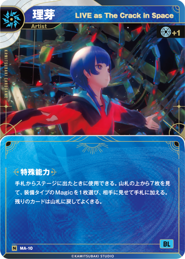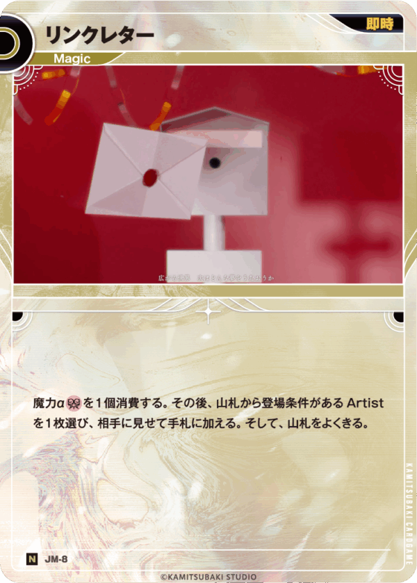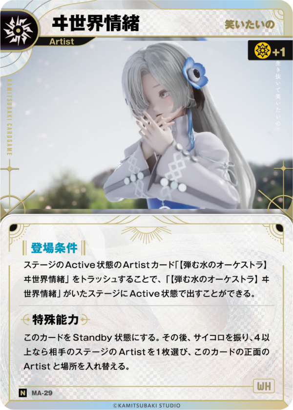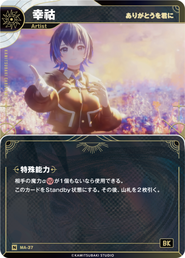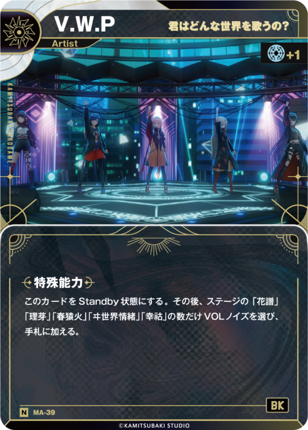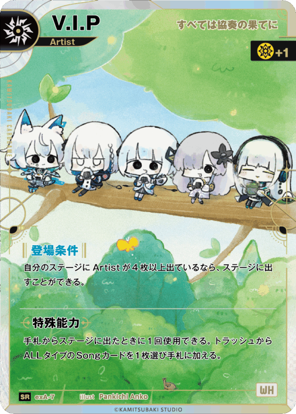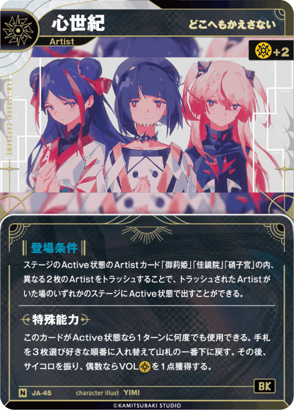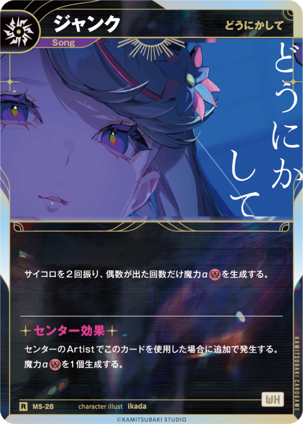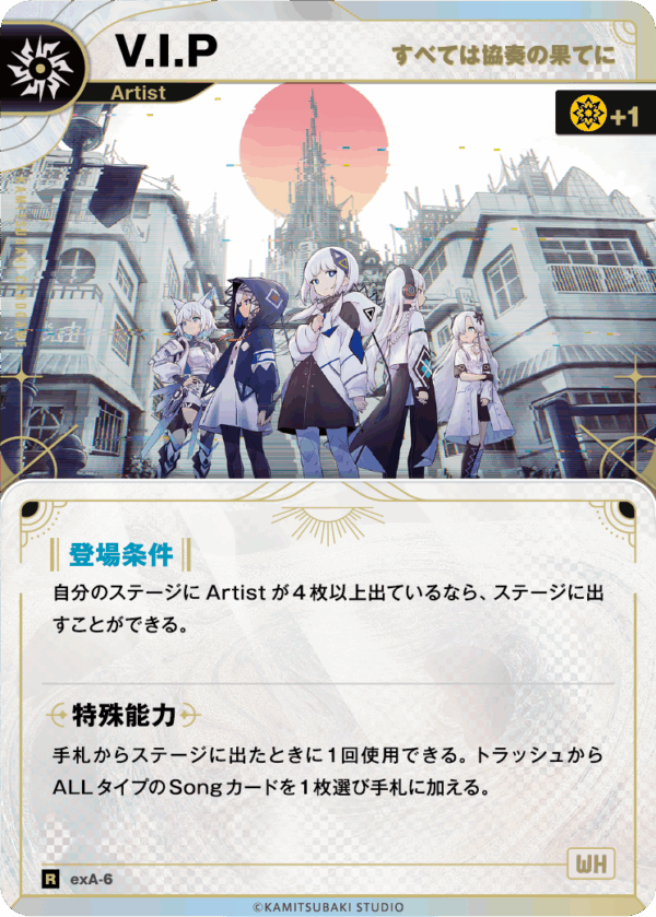 自分のターンに1回使用できる。魔力αを2個消費する。その後、サイコロを振り、4以上ならArtist「CHINO」「MYU」「NEFFY」「RARA」「VITTE」のいずれかを山札から1枚選び、ステージにStandby状態で出す。そして、山札をよくきる。ただし、ステージが空いていない時、このカードの効果は使用できない。