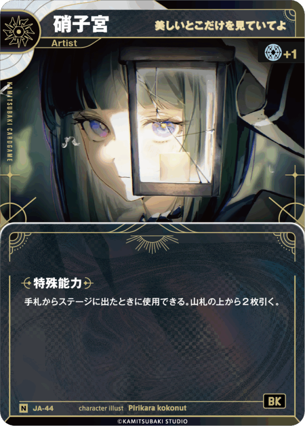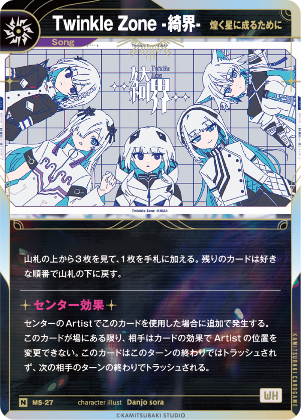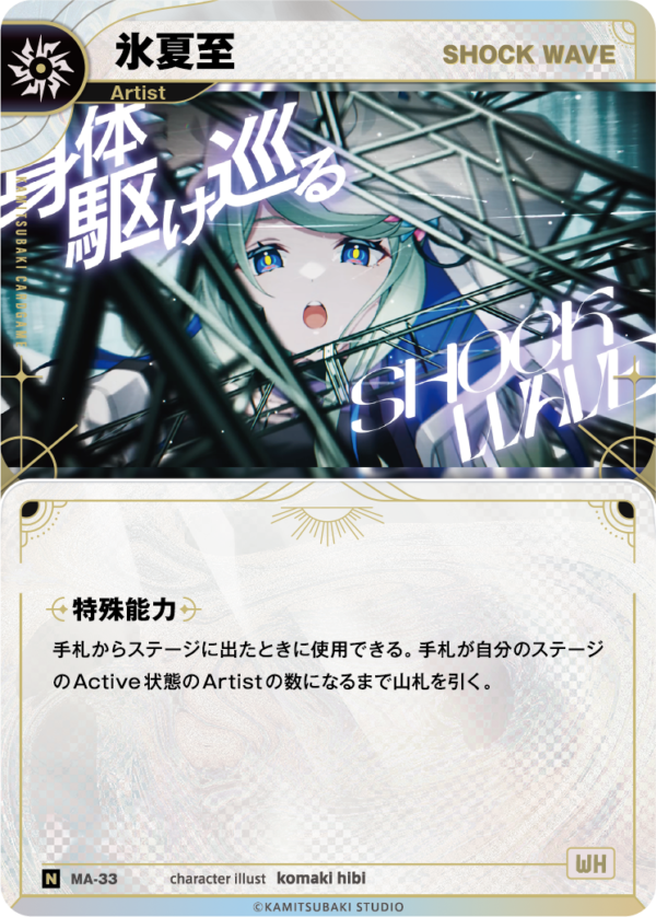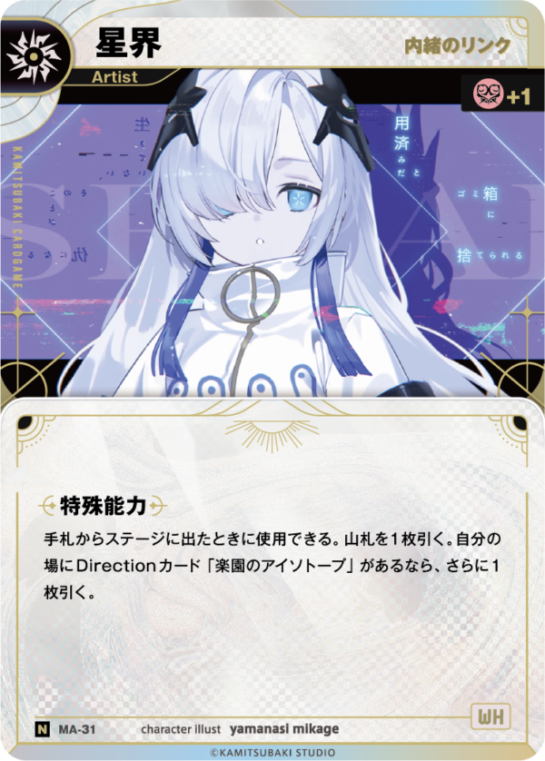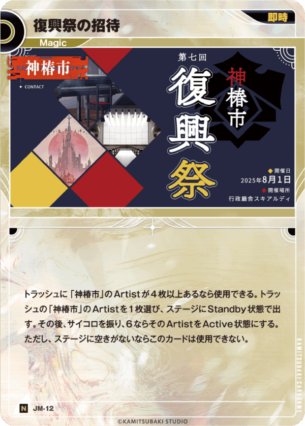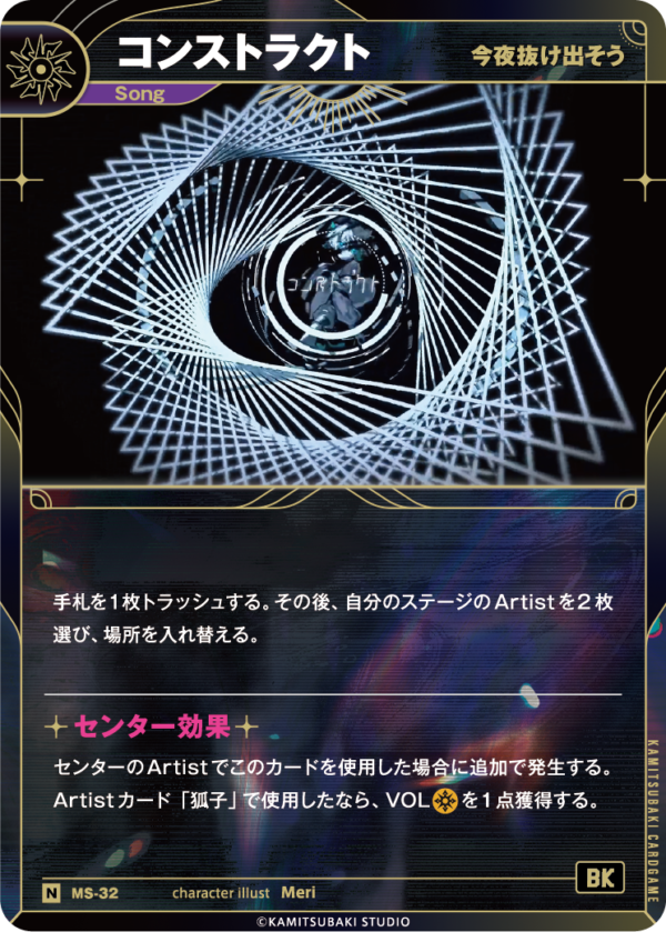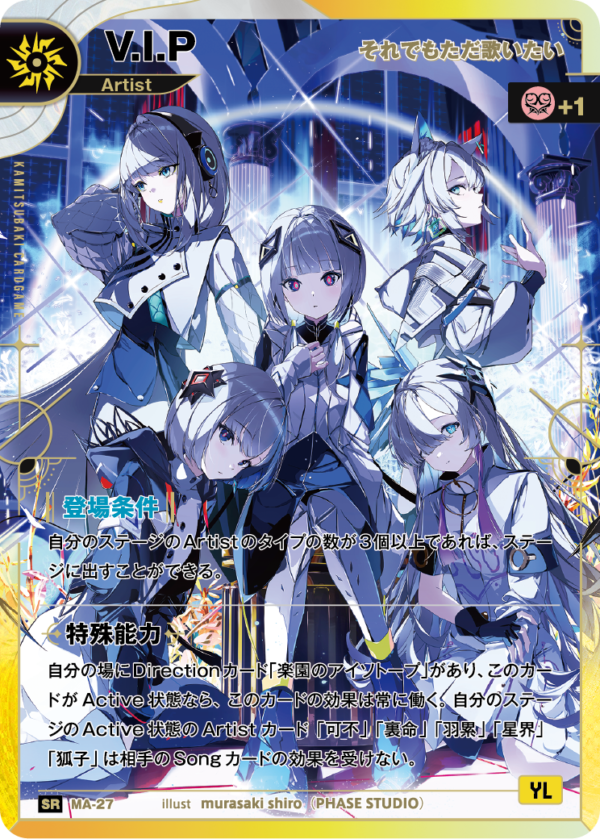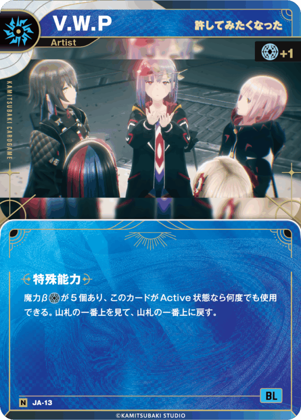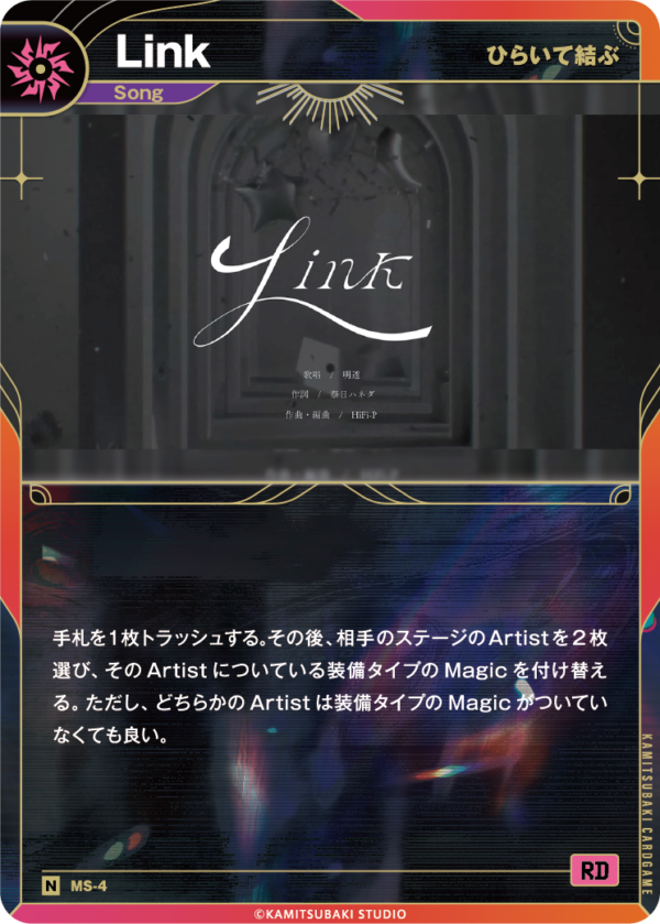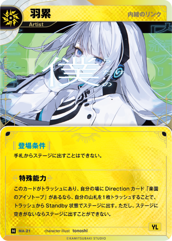 自分のターンに1回使用できる。魔力αを2個消費する。その後、サイコロを振り、4以上ならArtist「CHINO」「MYU」「NEFFY」「RARA」「VITTE」のいずれかを山札から1枚選び、ステージにStandby状態で出す。そして、山札をよくきる。ただし、ステージが空いていない時、このカードの効果は使用できない。