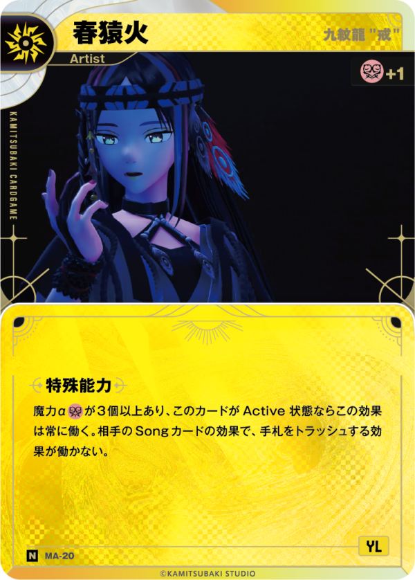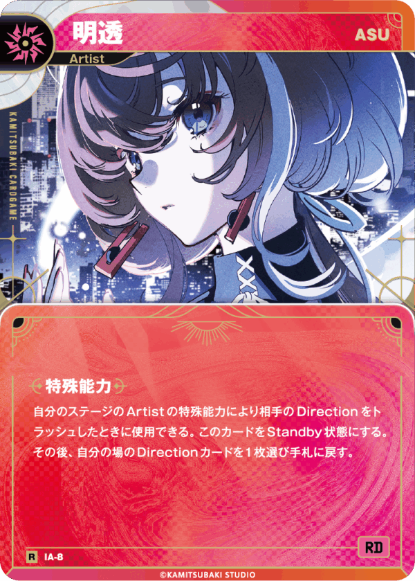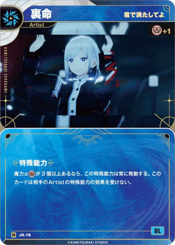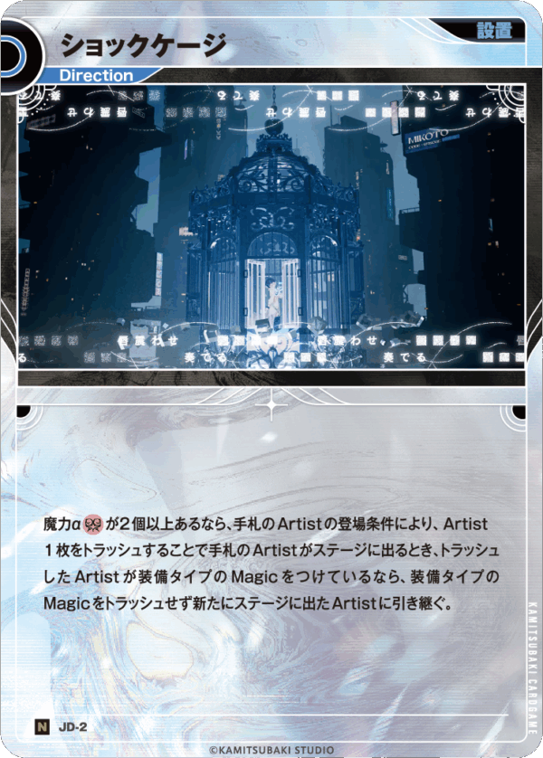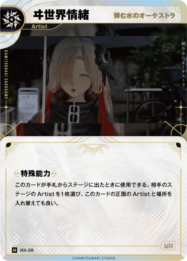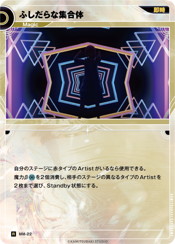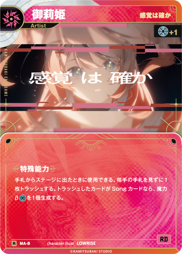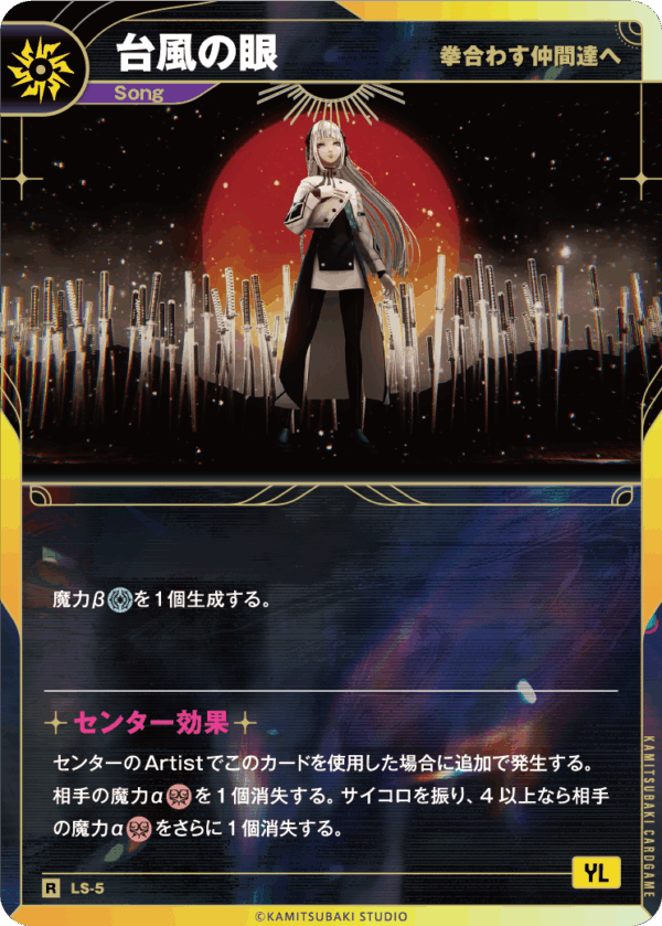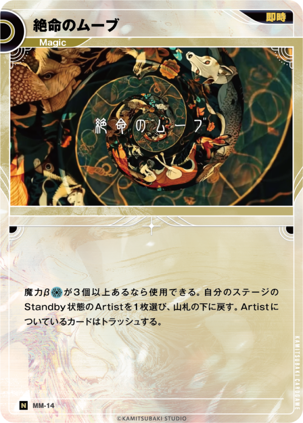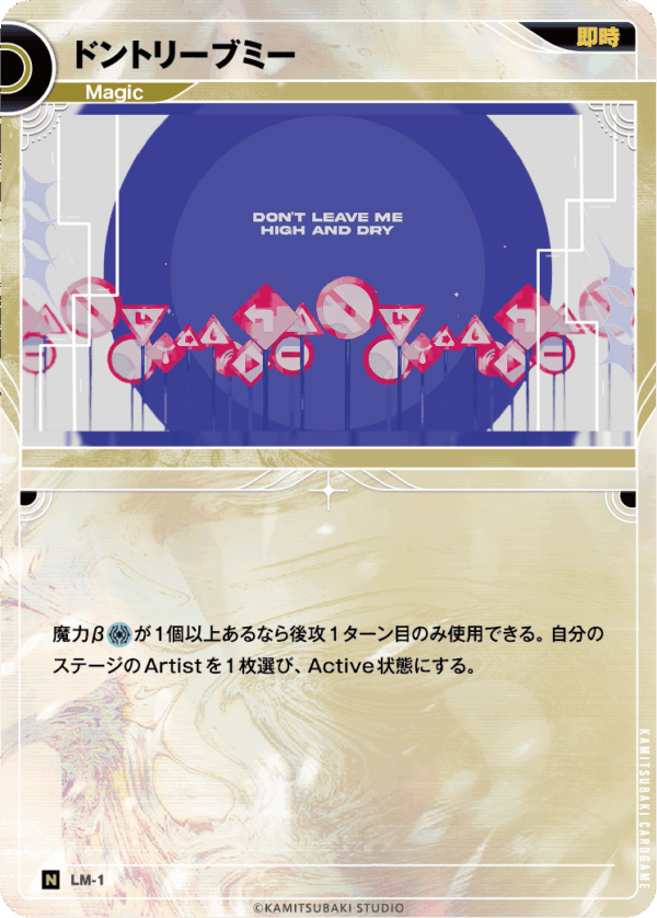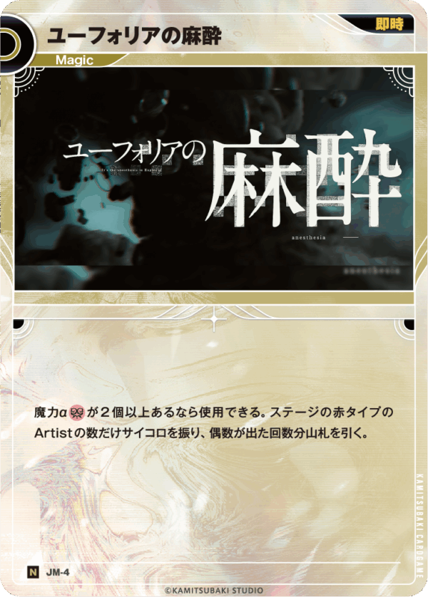 自分のターンに1回使用できる。魔力βを2個消費する。その後、サイコロを振り、4以上なら相手のステージのArtistを1枚選び、相手の手札に戻す。そのArtistについているカードはすべてトラッシュする。