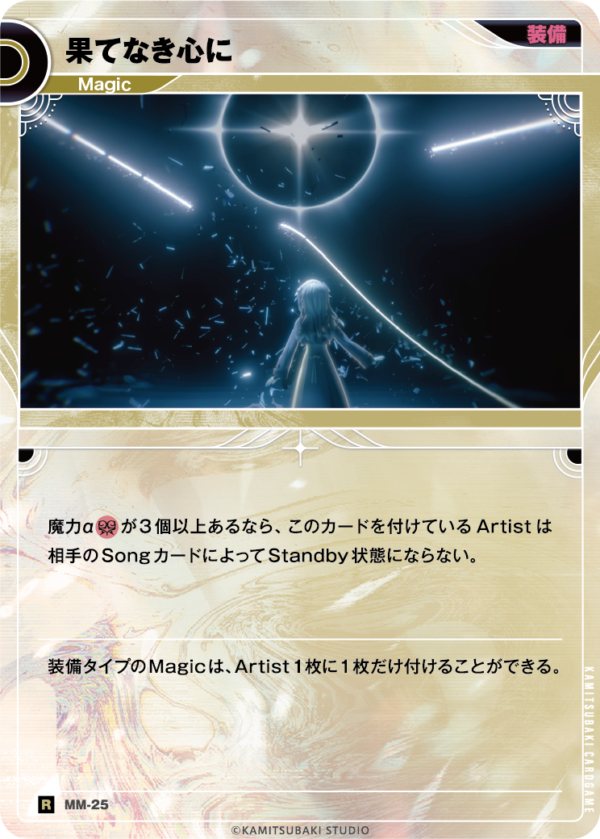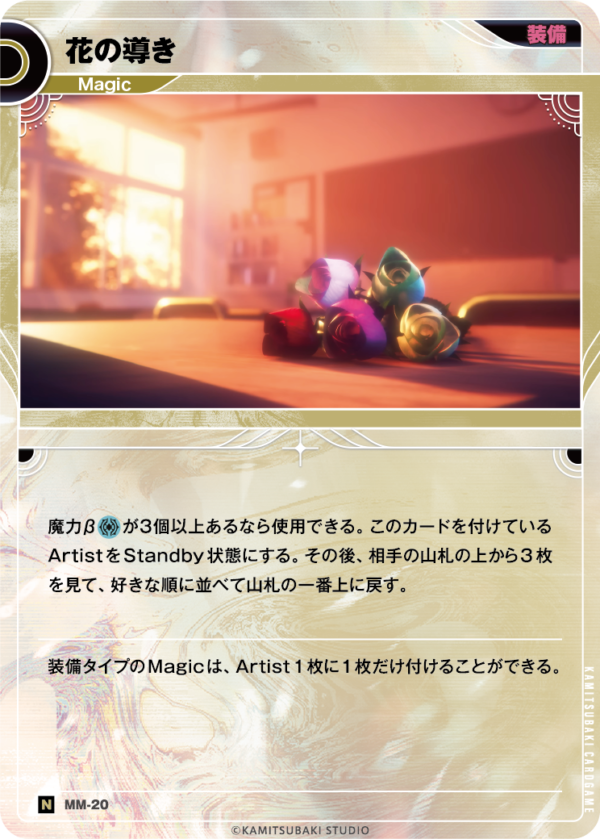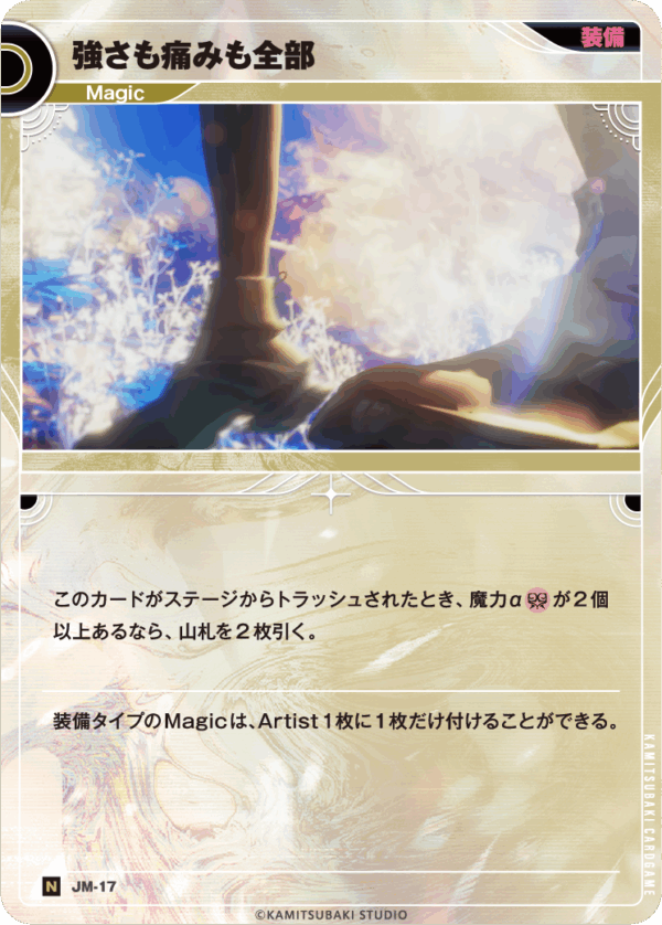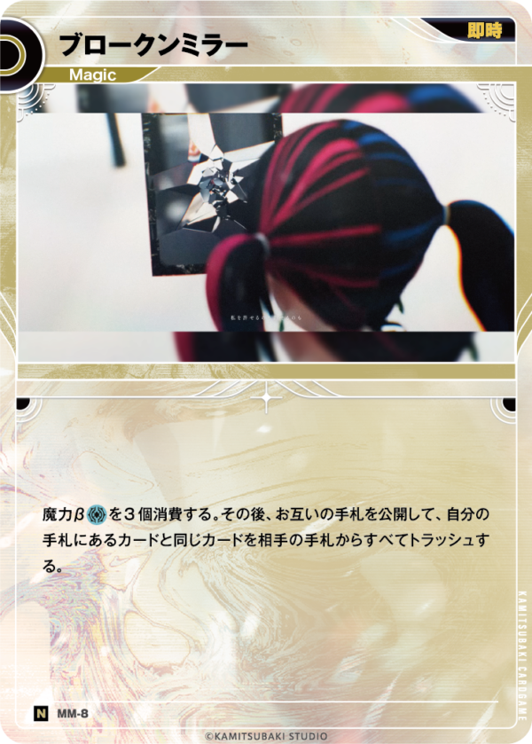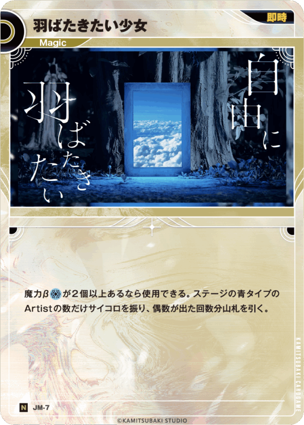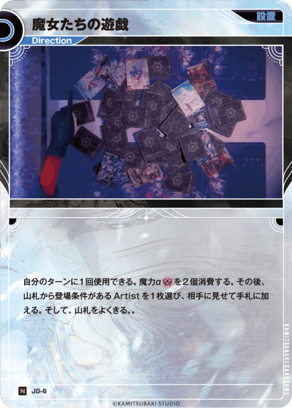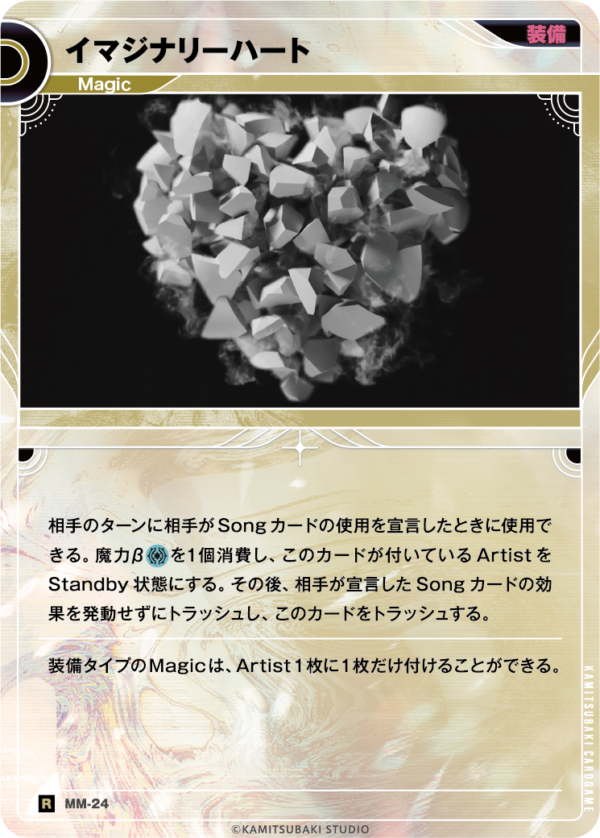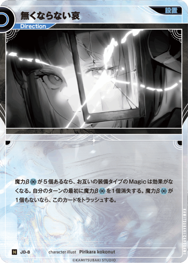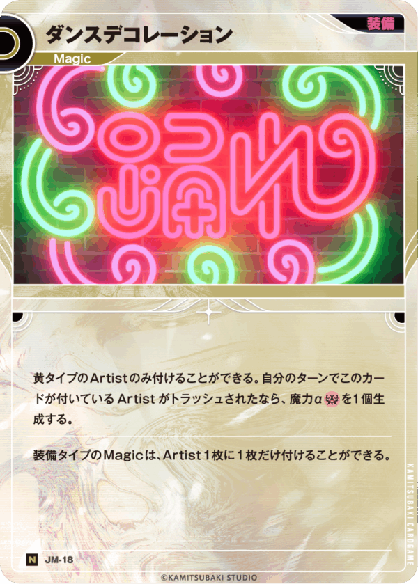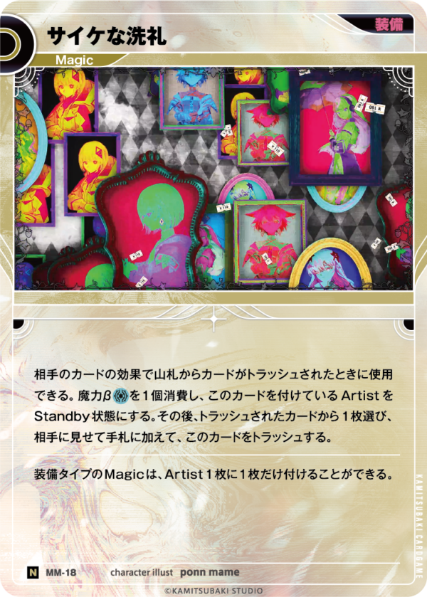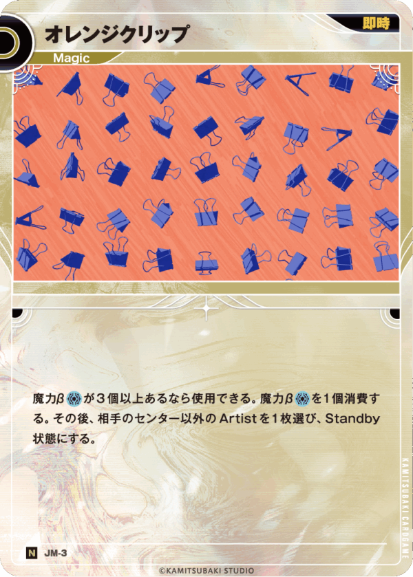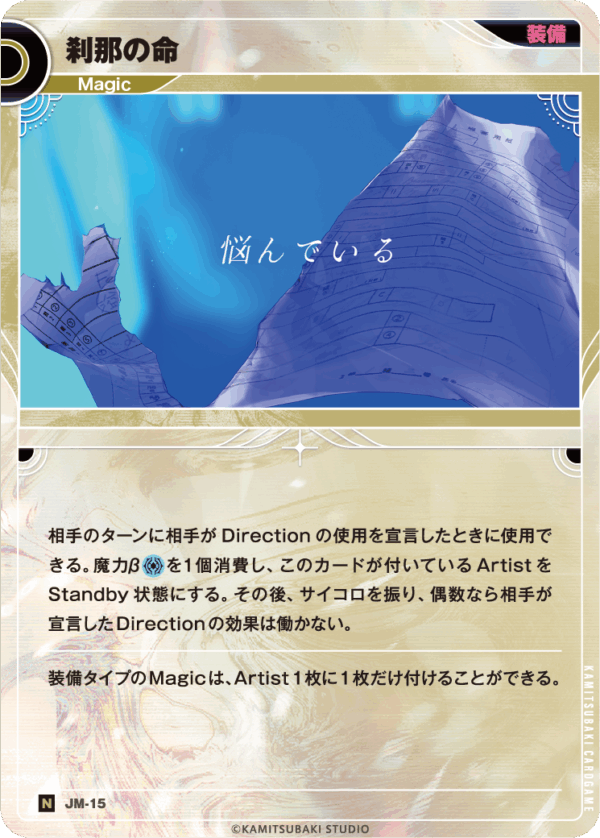 魔力βが3個以上あるなら、自分のターンに1回使用できる。サイコロを振り、5以上なら相手のArtistについている装備タイプのMagicカードを1枚選び、トラッシュする。