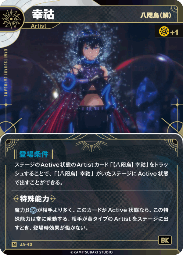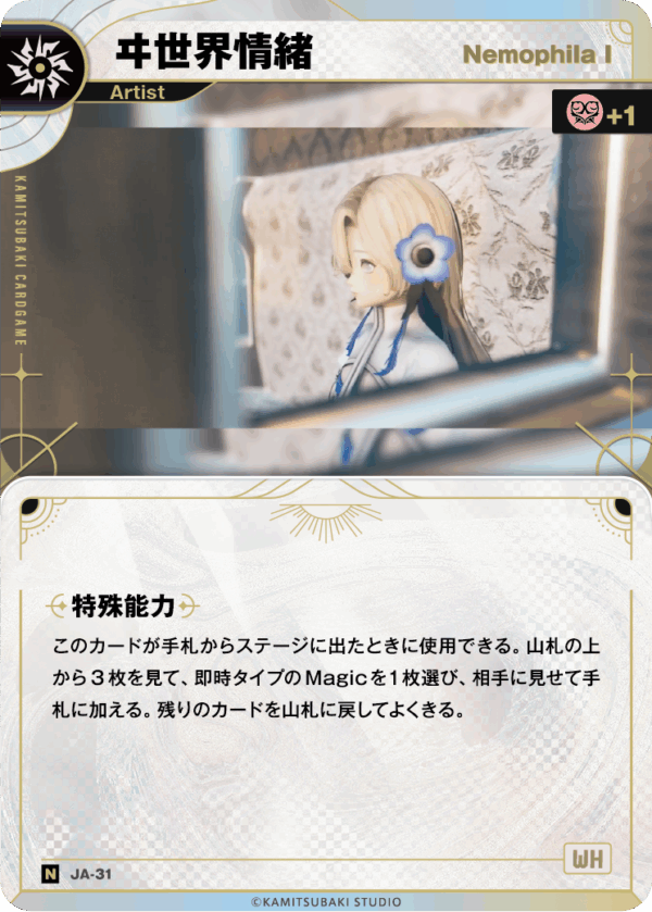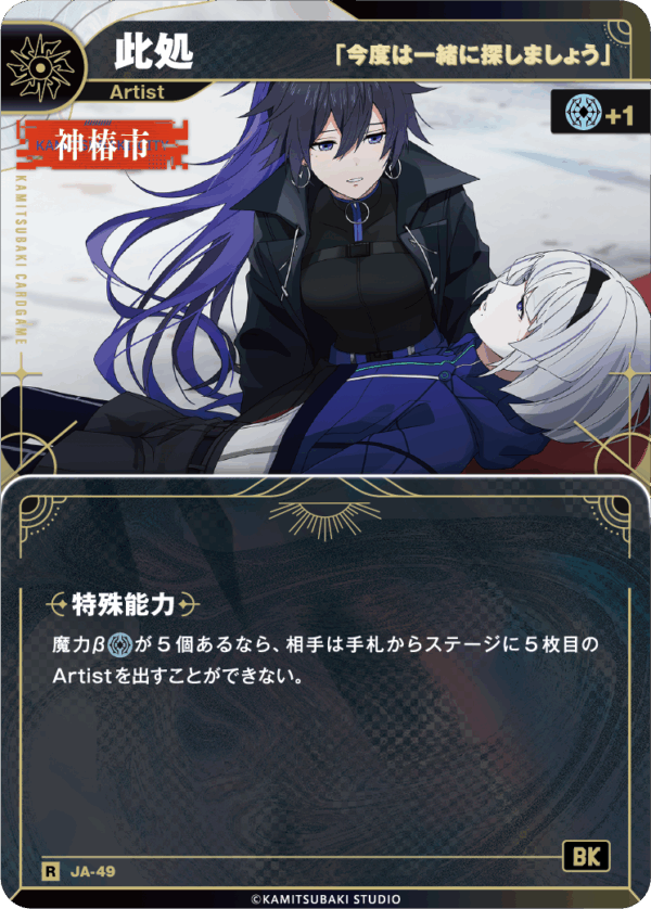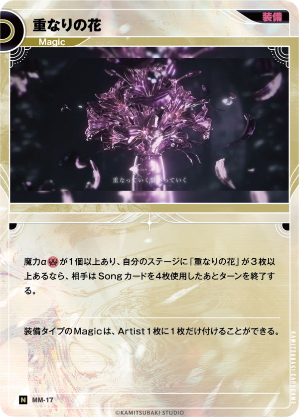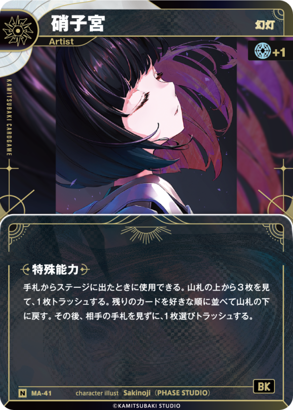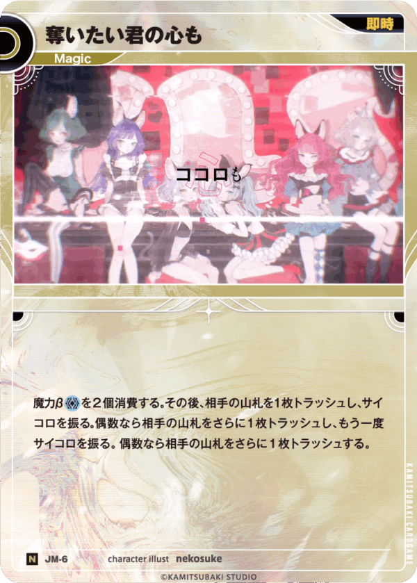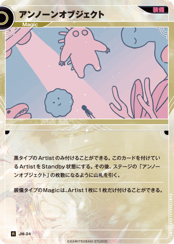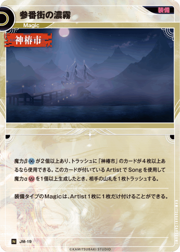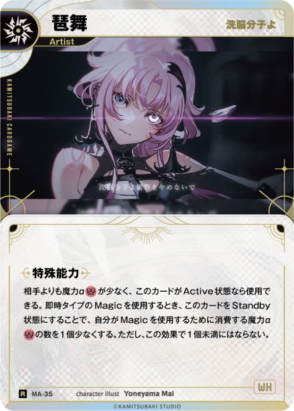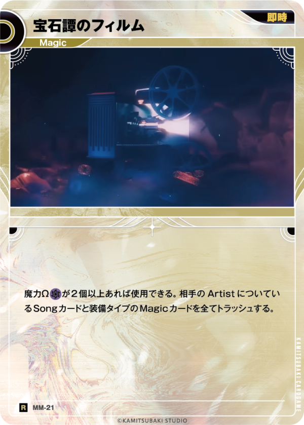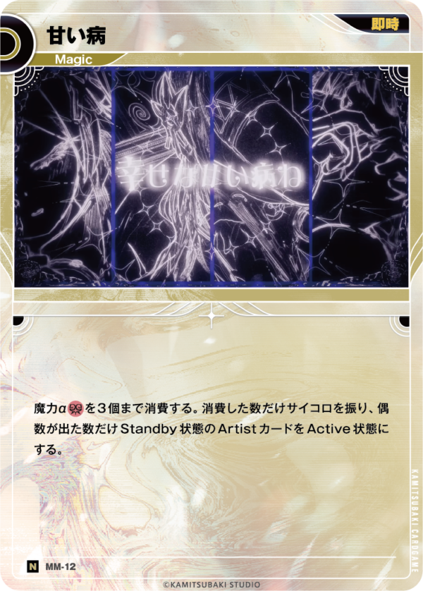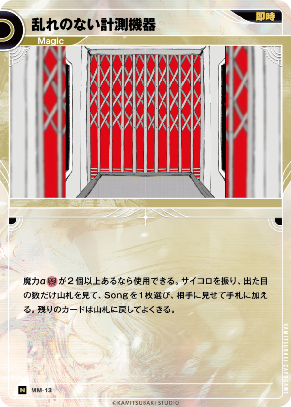 魔力βが3個以上あるなら、自分のターンに1回使用できる。サイコロを振り、5以上なら相手のArtistについている装備タイプのMagicカードを1枚選び、トラッシュする。