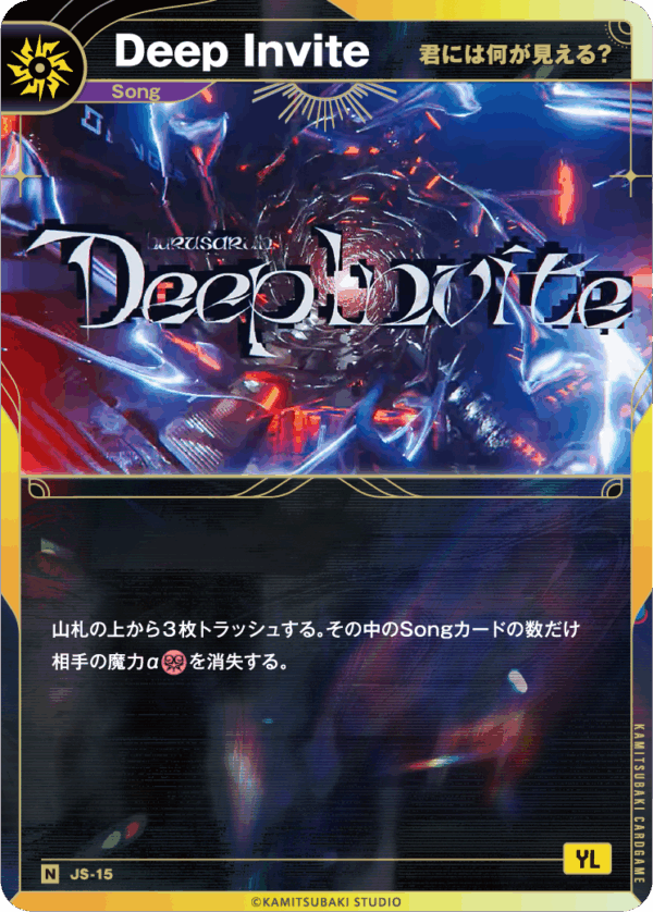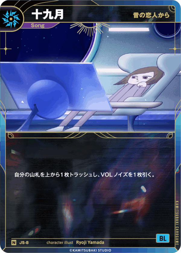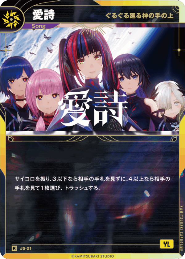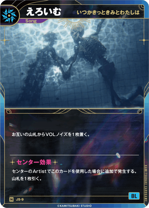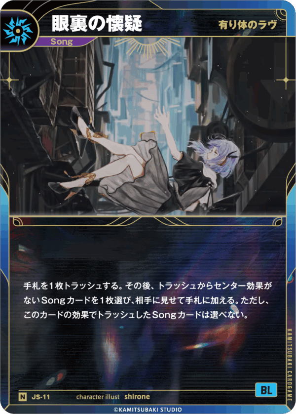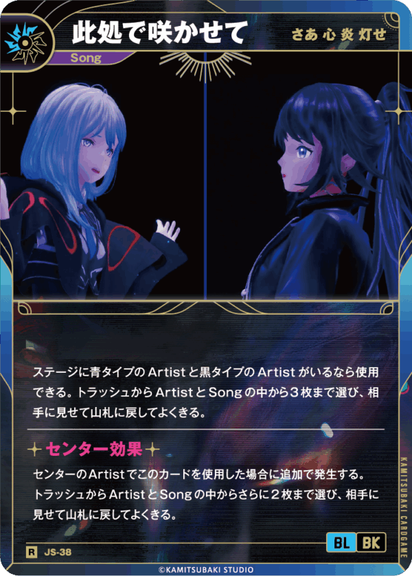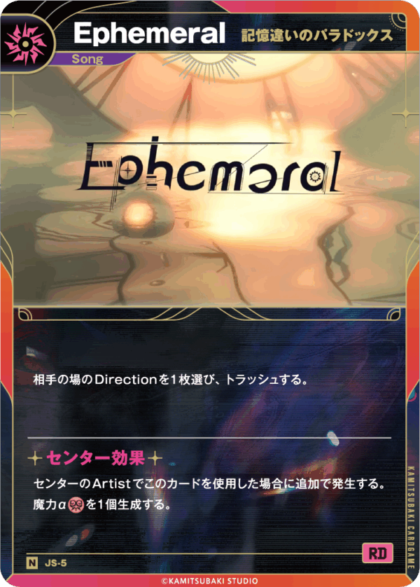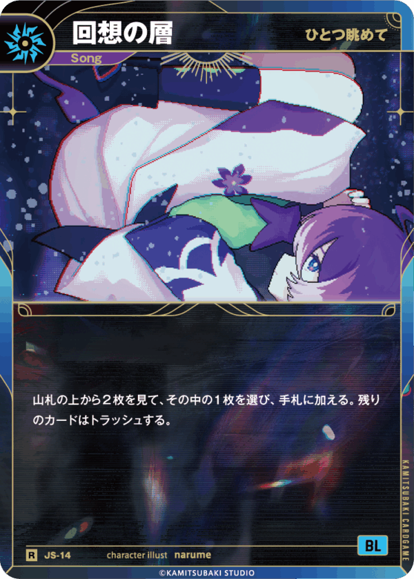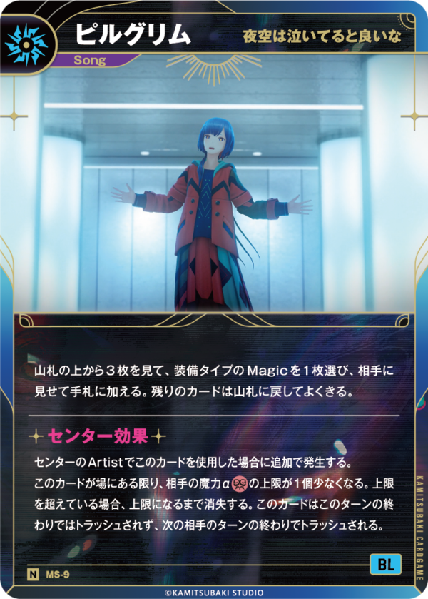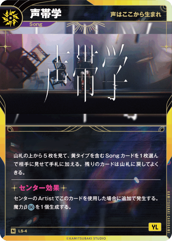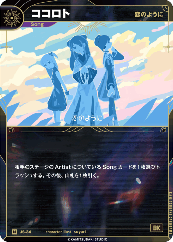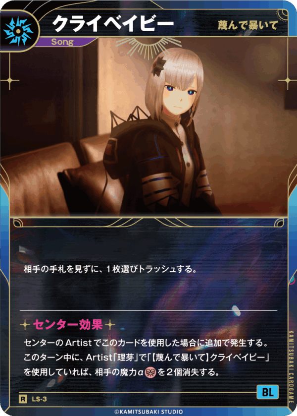 手札からステージに出たときに使用できる。山札からSongカードを1枚選び、トラッシュする。そして、山札をよくきる。