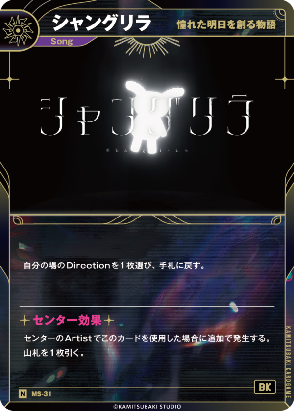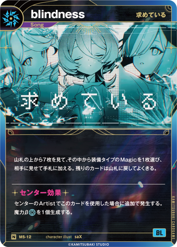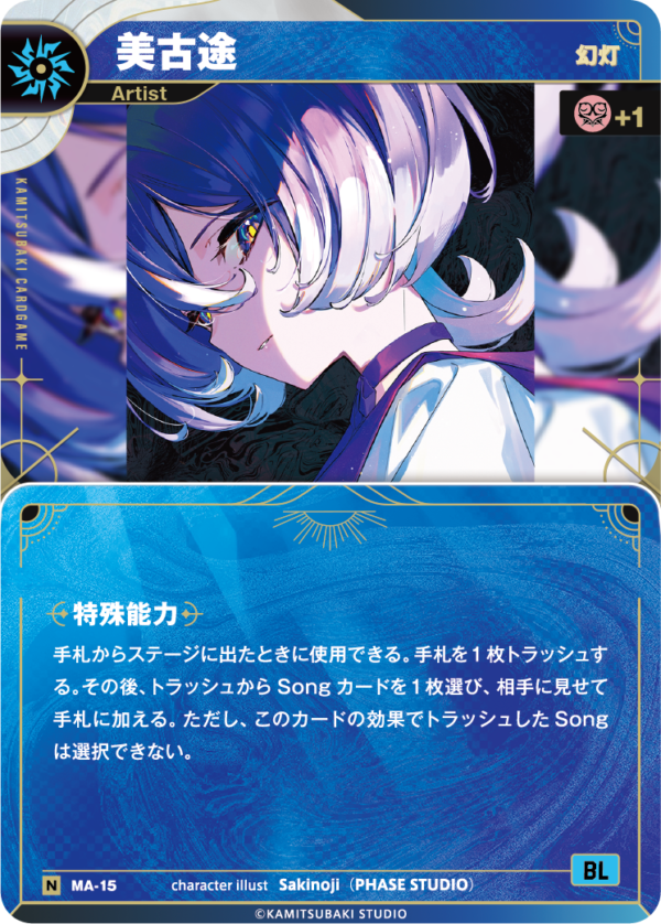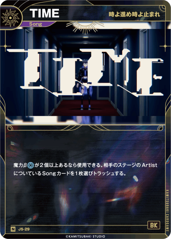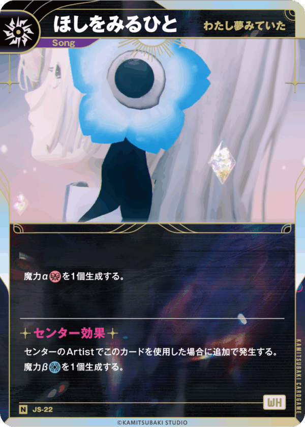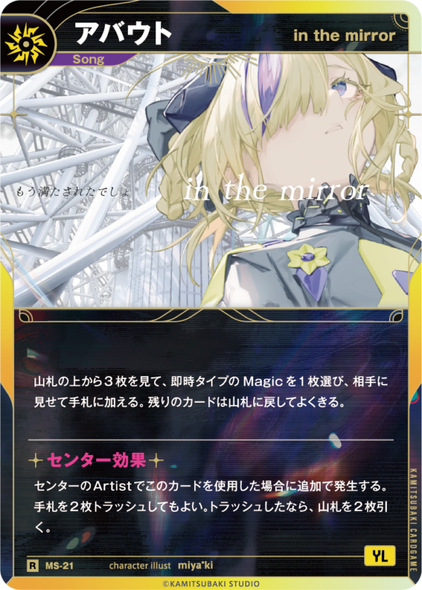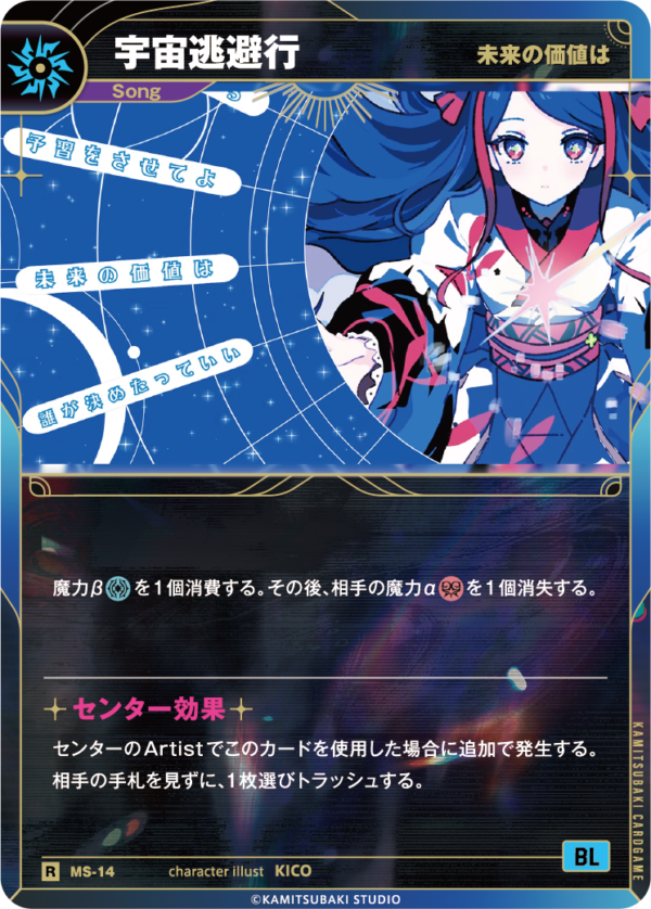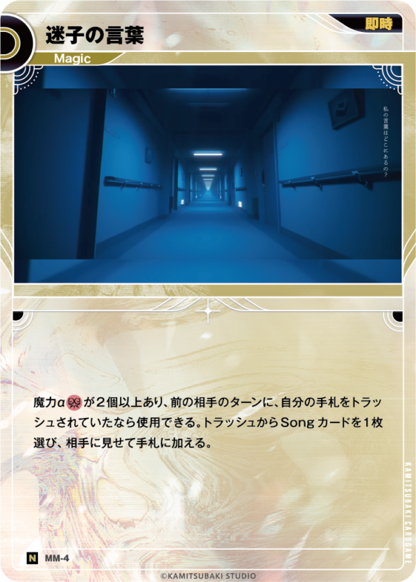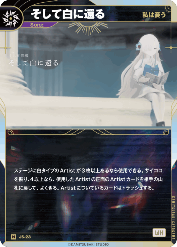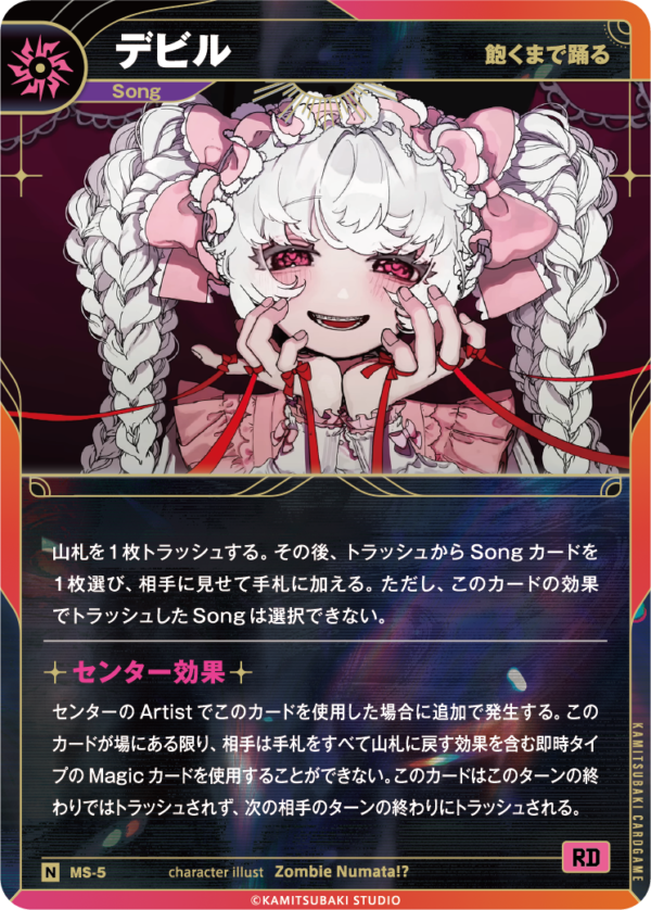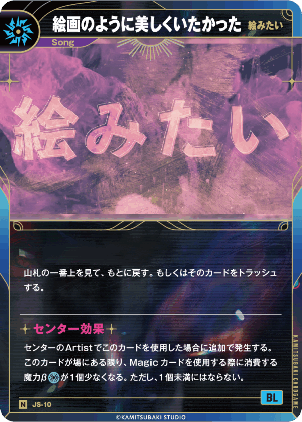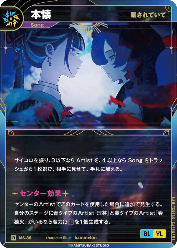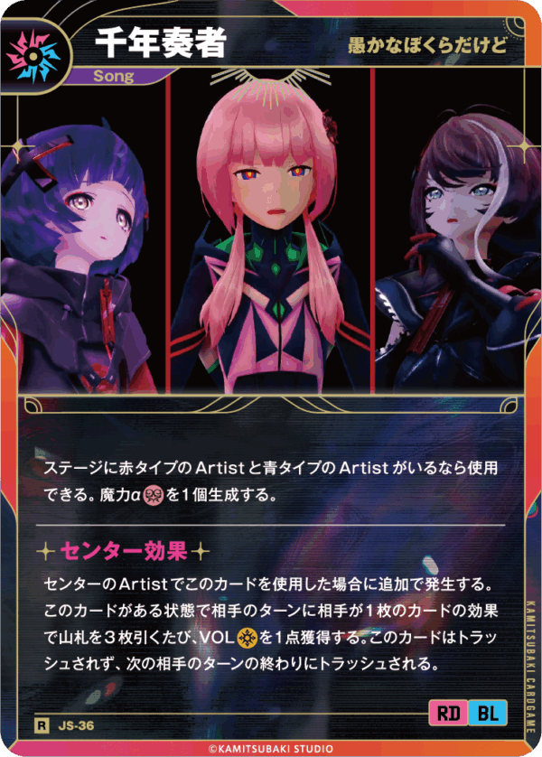 手札からステージに出たときに使用できる。山札からSongカードを1枚選び、トラッシュする。そして、山札をよくきる。