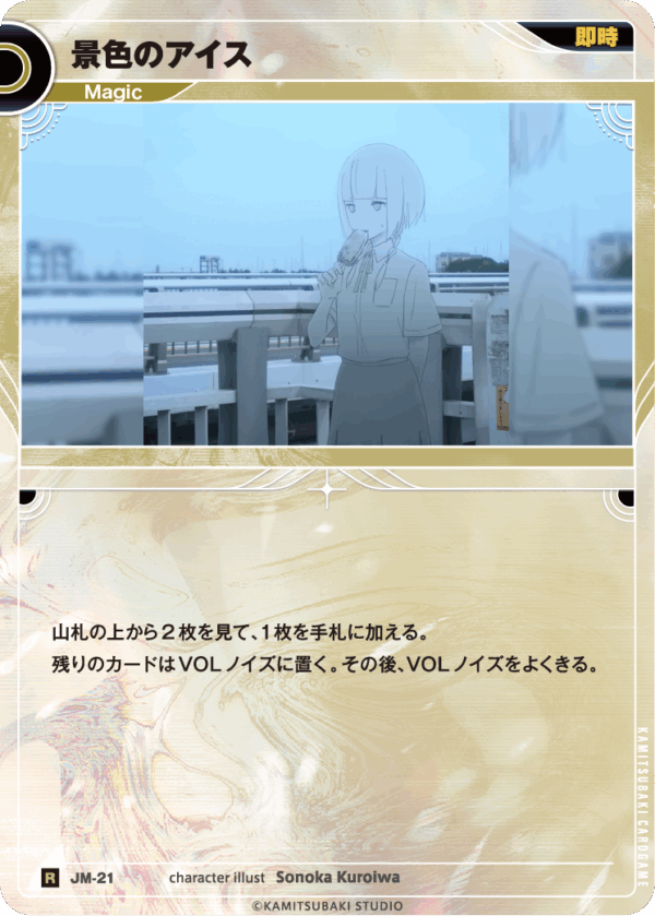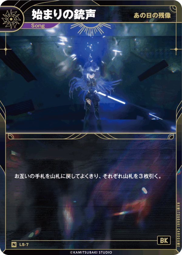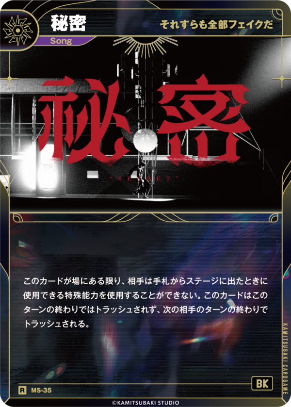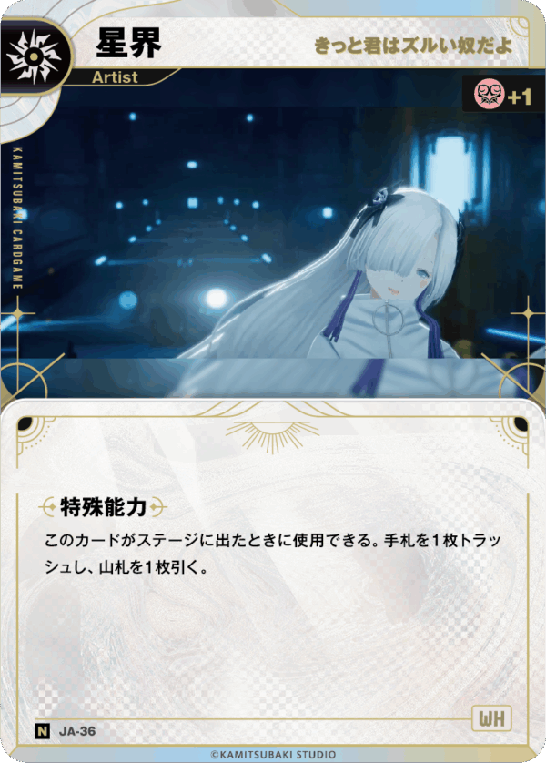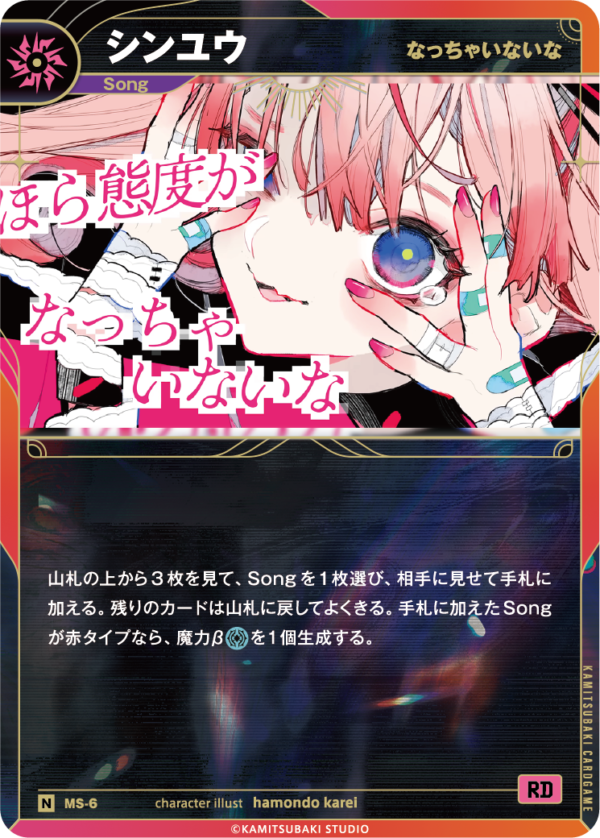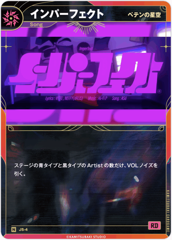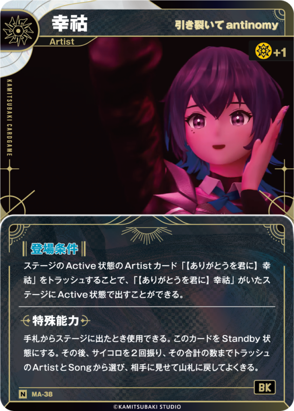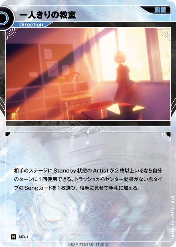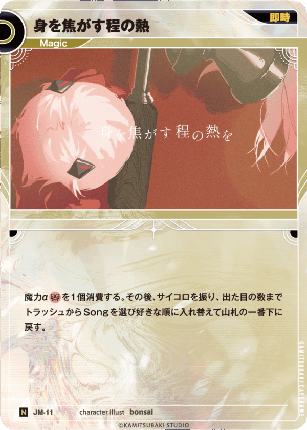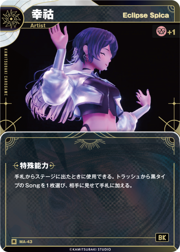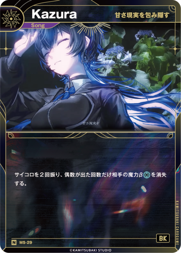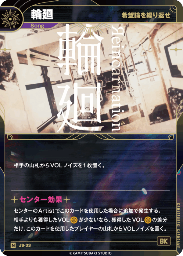 手札からステージに出たときに使用できる。山札からSongカードを1枚選び、トラッシュする。そして、山札をよくきる。