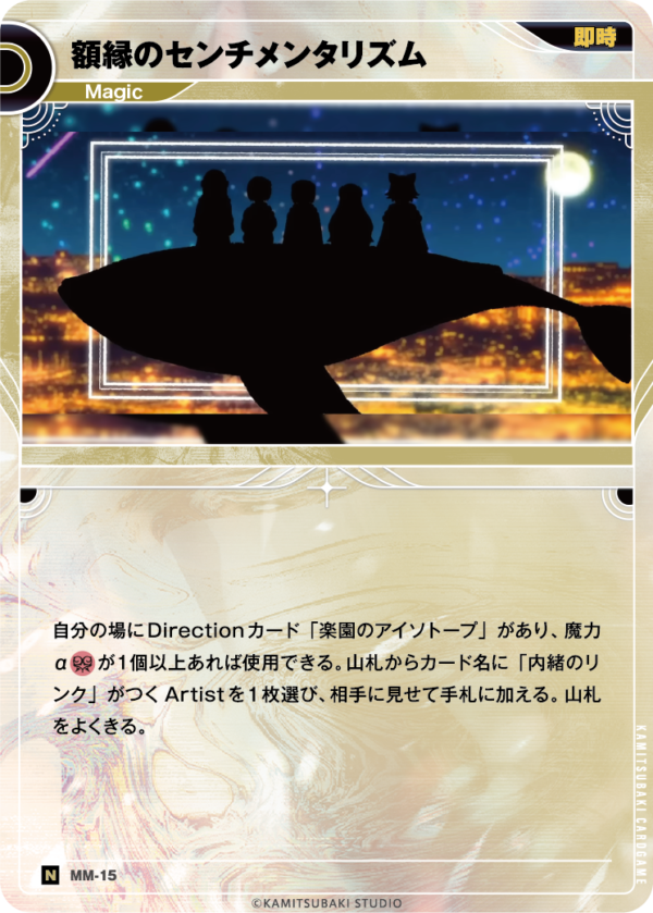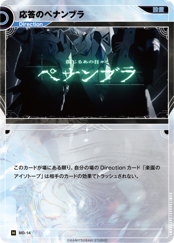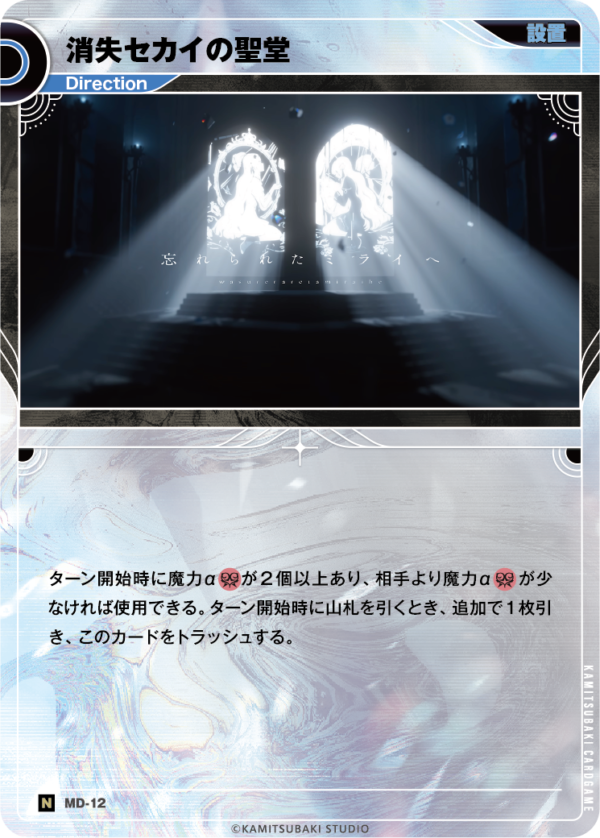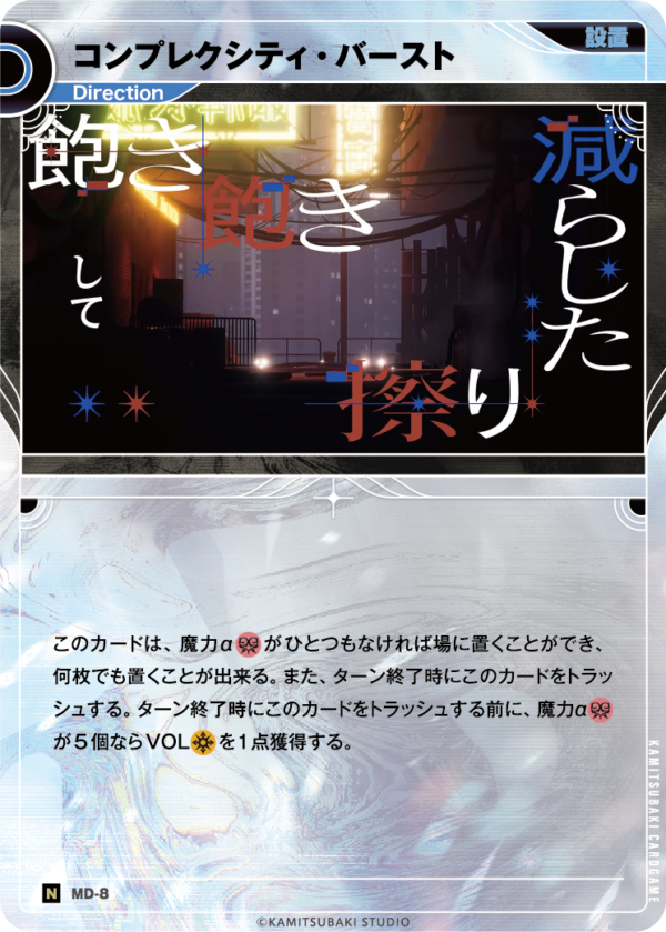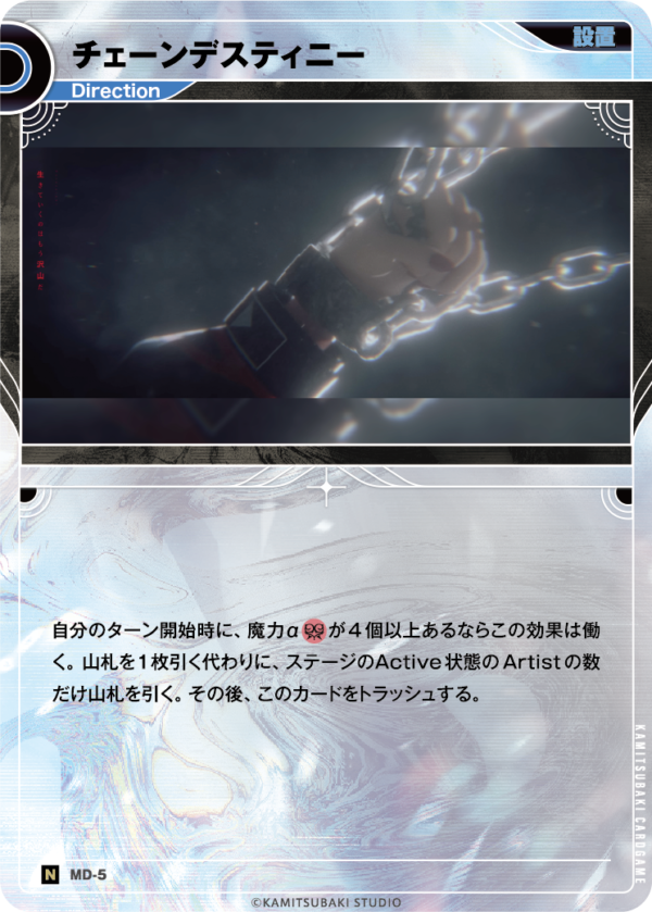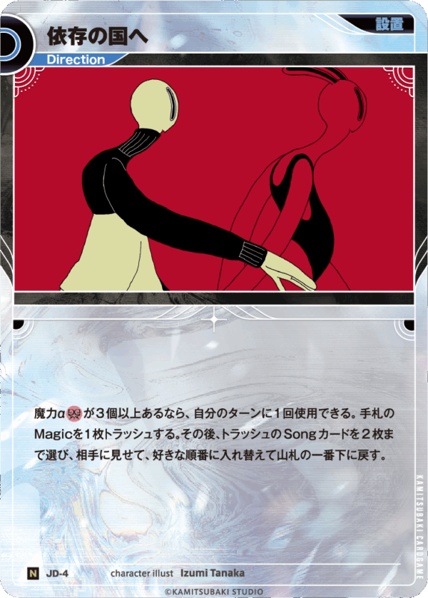 魔力αが4個以上あるなら、このカード以外の自分の場のDirectionカードは相手のMagicカードの効果によるトラッシュする効果をうけない。