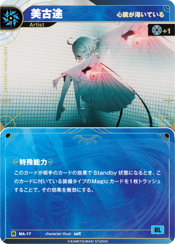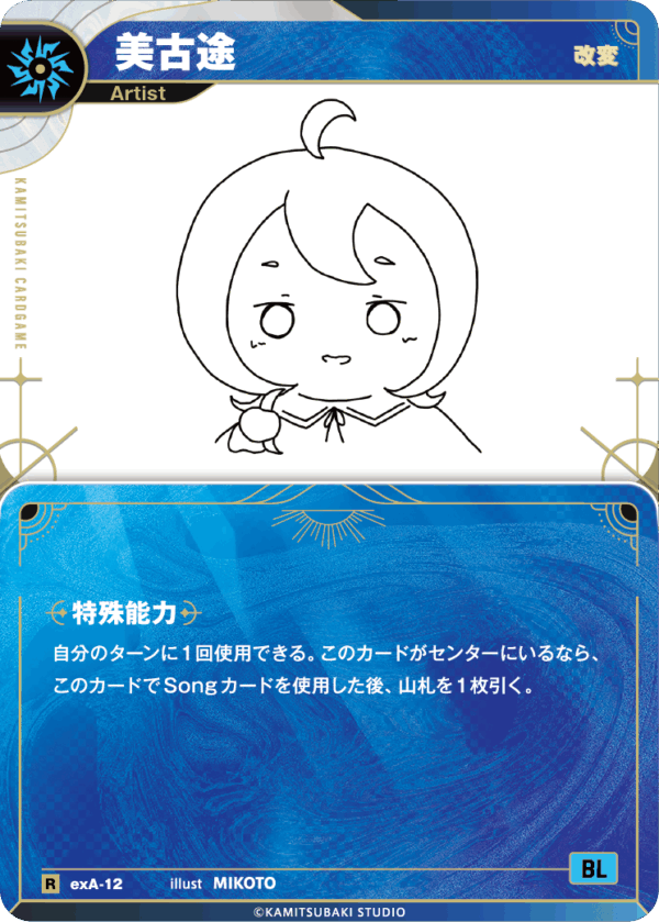 自分のターンに1回使用できる。サイコロを振り、5以上なら山札から青タイプのArtistを1枚選び、相手に見せて手札に加え、山札をよくきり、このカードをトラッシュする。
