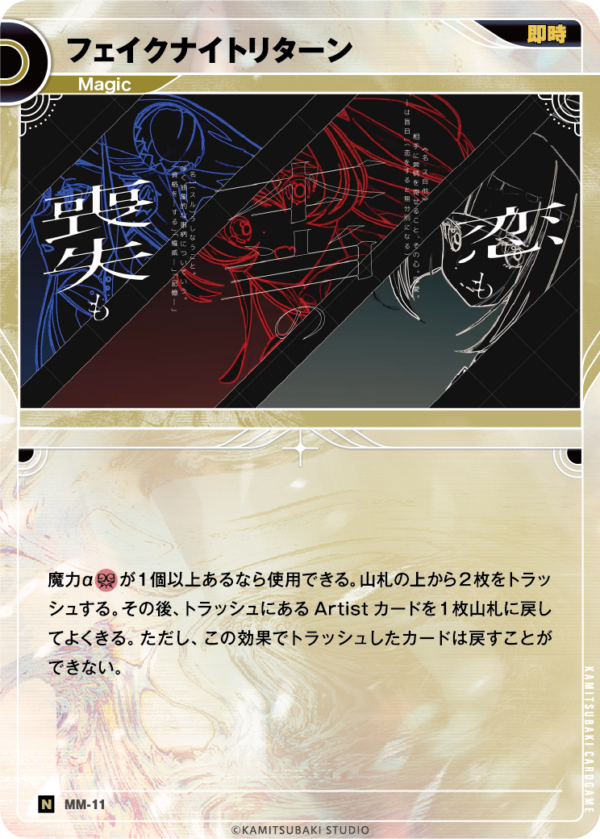 魔力Ωが2個以上あるなら、自分のターンに1回使用できる。手札を2枚トラッシュし、山札から登場条件がないArtistを1枚選び、相手に見せて手札に加える。そして、山札をよくきる。