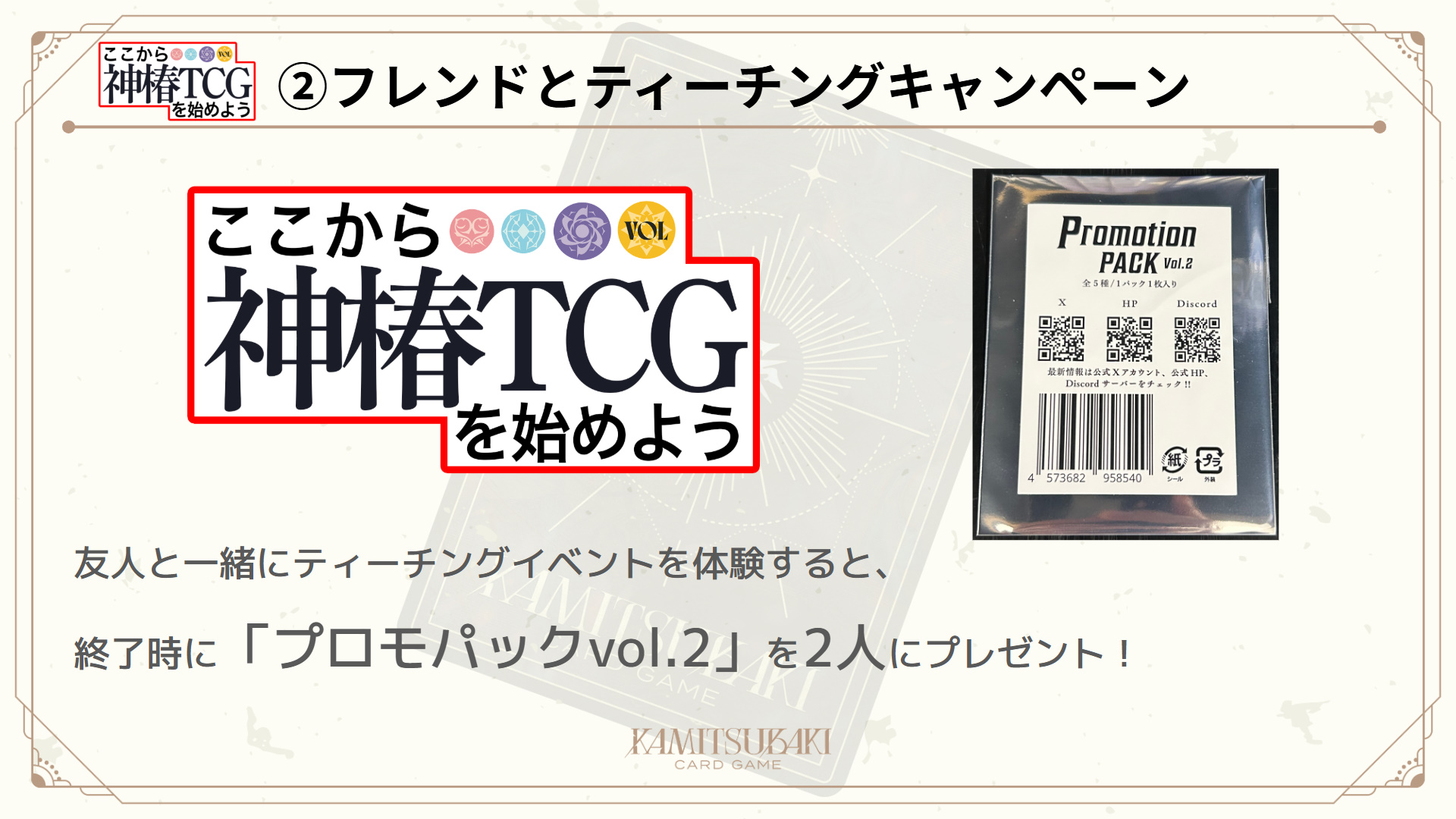 また本イベントは『「ここから神椿TCGを始めよう」キャンペーン』の対象イベントとなり「フレンドとティーチングキャンペーン」を実施しています。