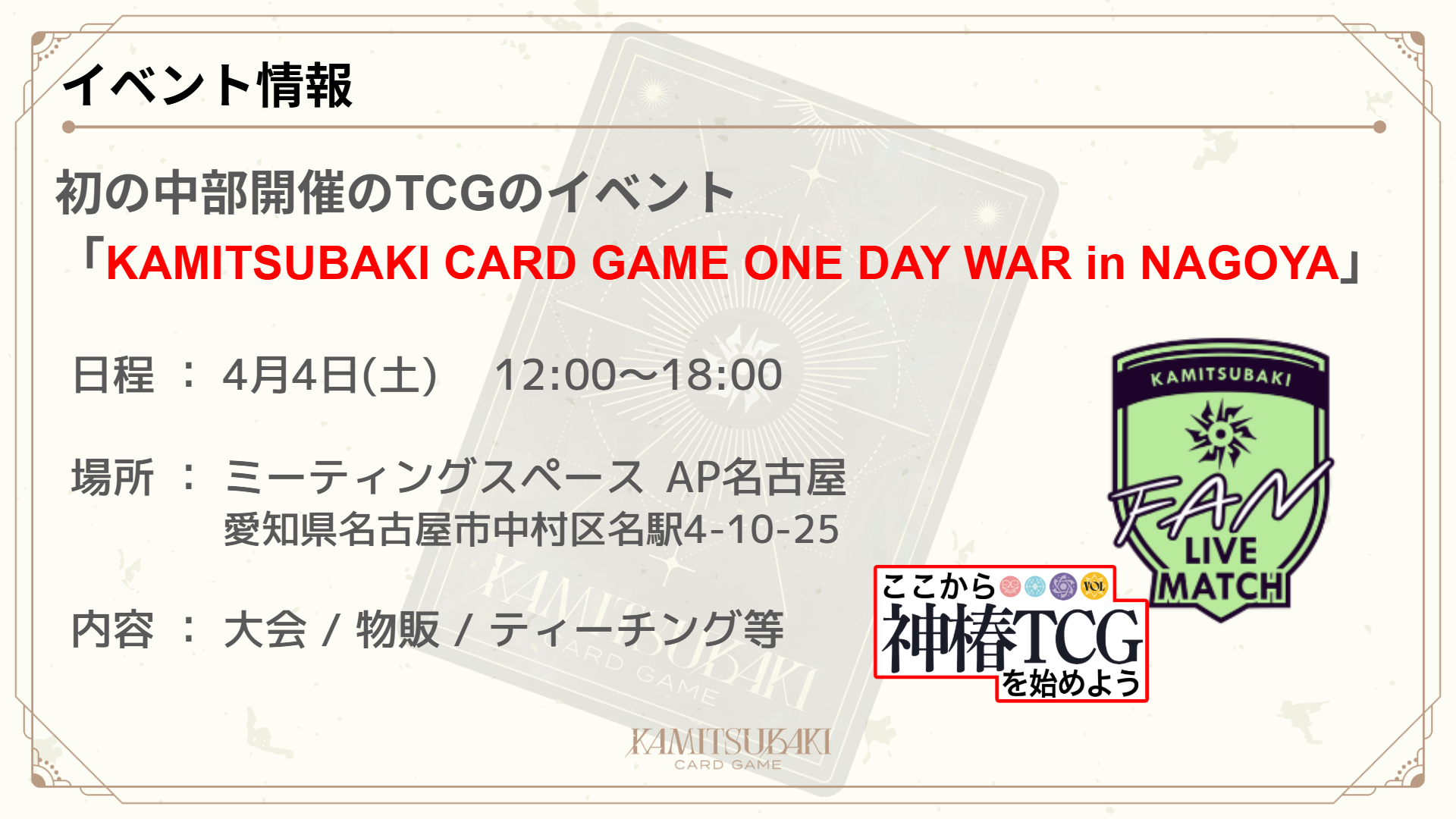 「KAMITSUBAKI CARD GAME ONE DAY WAR in NAGOYA」イベント詳細