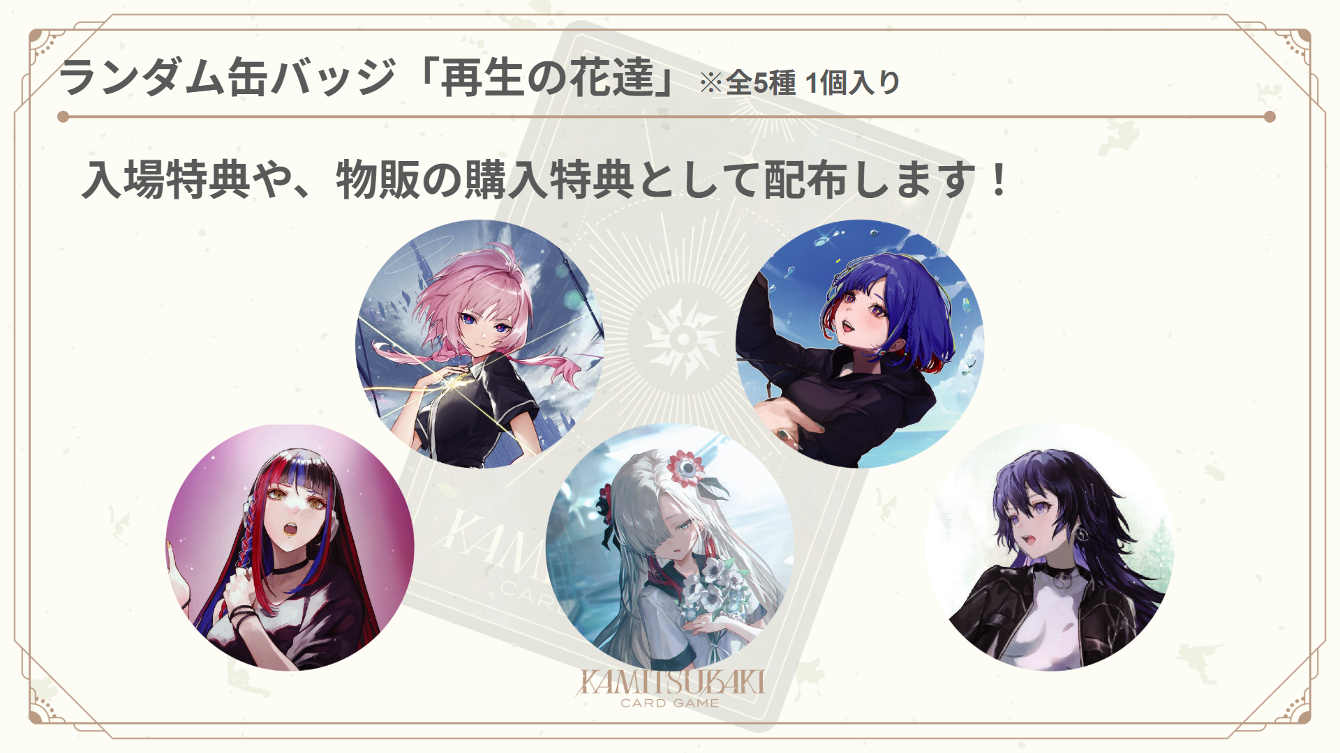 本イベントにご来場いただいた方へ、ランダム缶バッジ「再生の花達 SR(全5種)」を配布いたします。
